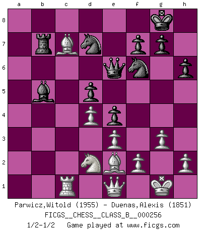 Last move : 1/2-1/2 2017 July 23 20:45:1 [Event "FICGS__CHESS__CLASS_B__000256"] [Site "FICGS"] [Date "2017.04.02"] [Round "1"] [White "Parwicz,Witold"] [Black "Duenas,Alexis"] [Result "1/2-1/2"] [WhiteElo "1955"] [BlackElo "1851"] 1.d4 Nf6 2.c4 e6 3.Nf3 b6 4.g3 Ba6 5.Nbd2 Bb4 6.Qc2 Bb7 7.Bg2 Be4 8.Qd1 O-O 9.O-O Bxd2 10.Qxd2 a5 11.b3 d6 12.Bb2 a4 13.Bc3 Nbd7 14.Rfc1 Re8 15.Qd1 h6 16.e3 e5 17.bxa4 Qe7 18.a5 bxa5 19.a4 Qe6 20.c5 Reb8 21.cxd6 cxd6 22.Bf1 Bd5 23.Rab1 Bb3 24.Qe1 e4 25.Nd2 Bxa4 26.Rxb8+ Rxb8 27.Bxa5 d5 28.Be2 Bb5 29.Bc7 Rb7 30.Rb1 Qc6 31.Rc1 Qe6 1/2-1/2 Queen's Indian : Nimzovich variation (exaggerated Fianchetto) Kingside Castling by player Black (move 8) Kingside Castling by player White (move 9) This chess game ended in a draw. Follow this game move after move (download)If cunning alone were needed to excel, women would be the best Chess players. (Albin) Das Schachspiel ist ein See, in welchem eine Mücke baden und ein Elefant ertrinken kann. (Emanuel Lasker) No hay otro maestro que tenga una voluntad terrífica de ganar. Al tablero, el irradía peligro y aún los oponentes mas fuertes tienden a congelarse como liebres cuando olfatean a una pantera. Aún sus debilidades son peligrosas. Con las blancas, su juego de apertura es predecible - te es posible hacer planes en su contra - pero es tan fuerte que tus planes casi nunca funcionan. En el juego medio, su precisión e invención son fabulosas y en finales, tú simplemente no le puedes vencer. (Experto Alemán anónimo) Les échecs sont un jeu par leur forme, un art par leur essence et une science par sa difficulté d'acquisition. Ils peuvent vous procurer autant de plaisir qu'un bon livre ou une belle musique, mais vous n'aurez une réelle joie que si vous arrivez à bien jouer. (Tigran Petrosian) The difference between perseverance and obstinacy is that one comes from a strong will, and the other from a strong won't. (Henry Ward Beecher)