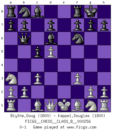 Last move : 0-1 2017 June 19 21:26:36 [Event "FICGS__CHESS__CLASS_B__000256"] [Site "FICGS"] [Date "2017.04.02"] [Round "1"] [White "Blythe,Doug"] [Black "Kappel,Douglas"] [Result "0-1"] [WhiteElo "1800"] [BlackElo "1800"] 1.d4 Nf6 2.Bg5 Ne4 3.Bf4 c5 4.f3 Qa5+ 5.c3 Nf6 6.d5 Qb6 7.Bc1 e6 8.e4 exd5 9.exd5 Bd6 10.Na3 O-O 0-1 Trompowsky attack (Ruth, Opovcensky Opening) Kingside Castling by player Black (move 10) Player Black won this chess game. Follow this game move after move (download)It is not enough to be a good player... you must also play well. (Siegbert Tarrasch) Schach ist gnadenlos. Du mußt bereit sein zu töten. (Nigel Short) No hay precio que no valga la pena por la cabellera del Rey enemigo. (Koblentz) Botvinnik disait en comparant les échecs à la musique: Il existe une science dont le but est l'étude de l'acoustique et des sons. Mais il y a aussi un art qui se sert de l'océan des sons : c'est la musique. De toute évidence, il en est de même pour la pensée. La logique est l'étude des lois de la réflexion et les échecs reflètent, en tant qu'art, le côté logique de la réflexion, sous la forme d'images artistiques... Extrait de Fischer - Spassky, Reykjavik 1972 par Alexander & F. Wyndham (Ed. Solar), p 37. It's not a bug - it's an undocumented feature. (Anonymous)