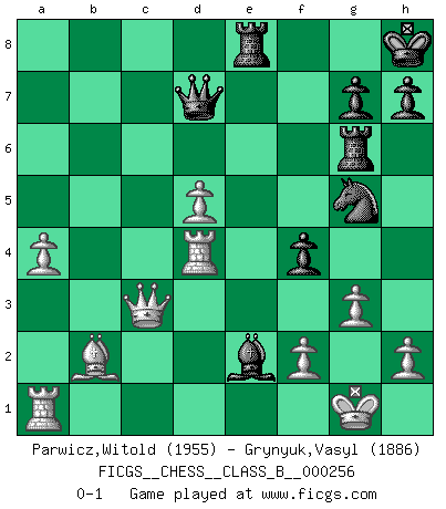 Last move : 0-1 2017 August 27 20:11:51 [Event "FICGS__CHESS__CLASS_B__000256"] [Site "FICGS"] [Date "2017.04.02"] [Round "1"] [White "Parwicz,Witold"] [Black "Grynyuk,Vasyl"] [Result "0-1"] [WhiteElo "1955"] [BlackElo "1886"] 1.d4 d5 2.c4 c6 3.Nf3 Nf6 4.e3 e6 5.Bd3 Nbd7 6.O-O Bd6 7.Nc3 O-O 8.e4 dxe4 9.Nxe4 Nxe4 10.Bxe4 Nf6 11.a3 Nxe4 12.Qc2 f5 13.Rd1 b6 14.b4 a5 15.c5 Bc7 16.Bb2 Bb7 17.Ne5 b5 18.bxa5 Bxa5 19.a4 b4 20.Qb3 Qd5 21.Nc4 Bc7 22.Qxb4 Ba6 23.Nb6 Qd8 24.Qb3 Rb8 25.g3 Bxb6 26.cxb6 Rxb6 27.Qxe6+ Kh8 28.Ba3 c5 29.Qe5 Ng5 30.Qxc5 Re8 31.d5 Rh6 32.Qc3 Be2 33.Rd3 f4 34.Bb2 Rg6 35.Rd4 Qd7 0-1 QGD Slav : 4.e3 Kingside Castling by player White (move 6) Kingside Castling by player Black (move 7) Player Black won this chess game. Follow this game move after move (download)Life is like a game of Chess, changing with each move. (Chinese proverb) Schach ist ein Reich, wo sich die menschliche Phantasie frei entfalten kann. (David Bronstein) Ciertamente el estado mental actual de Bobby Fischer es una tragedia. Uno de los mas grandes jugadores de Ajedrez del mundo -el orgullo y pena del Ajedrez Americano. (Frank Brady) Echiquier : carré parfait, comme la Jérusalem nouvelle décrite par l'auteur de l'Apocalypse, huit cases sur huit, exaltation du chiffre 4, symbole du cosmos aux quatre horizons... où le noir et le blanc, l'ombre et la lumière, le mal et le bien s'entremêlent et se conjuguent. (Robert Couffignal, Le Gambit du poète) Animated gif is worth one mega-word. (Unknown)