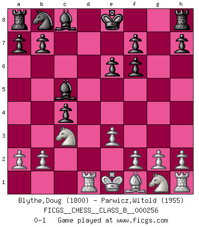 Last move : 0-1 2017 May 22 17:40:45 [Event "FICGS__CHESS__CLASS_B__000256"] [Site "FICGS"] [Date "2017.04.02"] [Round "1"] [White "Blythe,Doug"] [Black "Parwicz,Witold"] [Result "0-1"] [WhiteElo "1800"] [BlackElo "1955"] 1.d4 Nf6 2.Bg5 d5 3.e3 c5 4.Bxf6 gxf6 5.dxc5 e6 6.c4 dxc4 7.Nc3 Qxd1+ 8.Rxd1 Bxc5 0-1 This chess game has been lost on time (started : 2017.04.02 13:38:7) Trompowsky attack (Ruth, Opovcensky Opening) Player Black won this chess game. Follow this game move after move (download)Excellence at Chess is one mark of a scheming mind. (Sir Arthur Conan Doyle) Wenn ein Kopf und ein Buch zusammenstoßen und es klingt hohl, ist es denn allemal im Buche? (Georg Christoph Lichtenberg) Ser exitoso en el Ajedrez te permite descubrir tu propia personalidad. Eso es lo que deseo para los niños de mi clase. (Saudin Robovic) L'attaque fait le spectacle, la défense gagne les matchs. (Dicton footballistique) It is not true that people stop pursuing dreams because they grow old, they grow old because they stop pursuing dreams. (Gabriel Garcia Marquez)