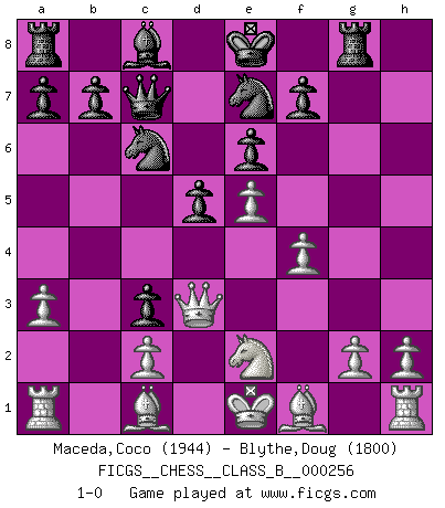 Last move : 1-0 2017 June 29 10:24:52 [Event "FICGS__CHESS__CLASS_B__000256"] [Site "FICGS"] [Date "2017.04.02"] [Round "1"] [White "Maceda,Coco"] [Black "Blythe,Doug"] [Result "1-0"] [WhiteElo "1944"] [BlackElo "1800"] 1.e4 e6 2.d4 d5 3.Nc3 Bb4 4.e5 c5 5.a3 Bxc3+ 6.bxc3 Ne7 7.Qg4 Qc7 8.Qxg7 Rg8 9.Qxh7 cxd4 10.Ne2 dxc3 11.f4 Nbc6 12.Qd3 1-0 This chess game has been lost on time (started : 2017.04.02 13:38:7) French : Winawer, Advance, poisoned pawn variation Player White won this chess game. Follow this game move after move (download)When you see a good move, look for a better one. (Emanuel Lasker) Der Freibauer hat für mich eine Seele, genau wie der Mensch, Wünsche, die unerkannt in ihm schlummern, und Befürchtungen, von deren Existenz er selbst kaum ahnt. (Aaron Nimzowitsch) Cuando estes solo, cuando te sientas un extraño en el mundo, juega al Ajedrez. Esto levantará tu espiritu y será tu consejero de guerra. (Aristóteles) Les réformistes prétendent que les progrès de la théorie conduiront à la disparition des échecs, et qu'il faut, pour leur rendre vie, en remanier les règles. En réalité, qu'exprime cette affirmation? Le mépris de l'intuition, de l'imagination et de tous les autres éléments qui font des échecs un art. (Alexander Alekhine) Patience, use the Force, think ! (Obi-Wan Kenobi in Star Wars ep.2)