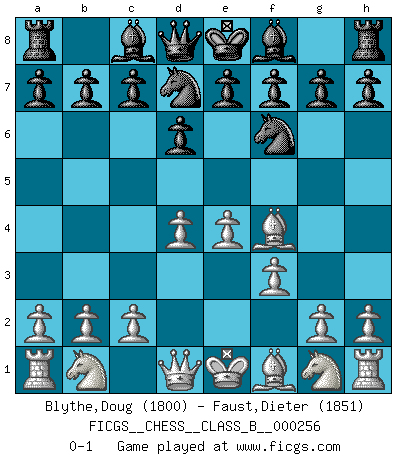 Last move : 0-1 2017 June 11 20:57:12 [Event "FICGS__CHESS__CLASS_B__000256"] [Site "FICGS"] [Date "2017.04.02"] [Round "1"] [White "Blythe,Doug"] [Black "Faust,Dieter"] [Result "0-1"] [WhiteElo "1800"] [BlackElo "1851"] 1.d4 Nf6 2.Bg5 Ne4 3.Bf4 d6 4.f3 Nf6 5.e4 Nbd7 0-1 This chess game has been lost on time (started : 2017.04.02 13:38:7) Trompowsky attack (Ruth, Opovcensky Opening) Player Black won this chess game. Follow this game move after move (download)Via the squares on the chessboard, the Indians explain the movement of time and the age, the higher influences which control the world and the ties which link Chess with the human soul. (Al-Masudi) Der zweitbeste Zug ist oft der einzig richtige. (Savielly Grigorievitsch Tartakower) ¡Examina movidas que hagan daño! Un buen ojo for movidas desvastantes es mucho mas importante que el conocimiento de principios estratégicos. (Purdy) La tactique est l'élément le plus important du milieu de jeu. (Siegbert Tarrasch) Only sick music makes money today. (Friedrich Nietzsche)