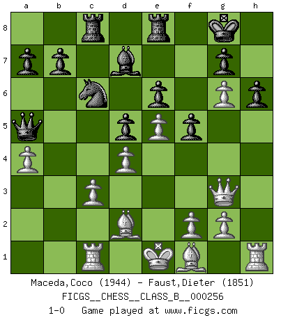 Last move : 1-0 2017 May 31 16:37:33 [Event "FICGS__CHESS__CLASS_B__000256"] [Site "FICGS"] [Date "2017.04.02"] [Round "1"] [White "Maceda,Coco"] [Black "Faust,Dieter"] [Result "1-0"] [WhiteElo "1944"] [BlackElo "1851"] 1.e4 e6 2.d4 d5 3.Nc3 Bb4 4.e5 c5 5.a3 Bxc3+ 6.bxc3 Qc7 7.Qg4 f5 8.Qg3 cxd4 9.cxd4 Ne7 10.Ne2 Nbc6 11.c3 Kf7 12.h4 Bd7 13.a4 Rac8 14.h5 h6 15.Nf4 Rhe8 16.Ng6 Qa5 17.Bd2 Nxg6 18.hxg6+ Kg8 19.Rc1 1-0 French : Winawer, Classical variation Player White won this chess game. Follow this game move after move (download)Chess is a terrible game. If you have no center, your opponent has a freer position. If you do have a center, then you really have something to worry about ! (Siegbert Tarrasch) Die meiste Zeit treffe ich auf Gegner, die meine Enkel sein könnten. Ich bin da, um ihnen zu zeigen, dass sie von mir noch einiges lernen können. (Viktor Kortschnoi) Vive, pierde y aprende al observar a tu oponente como ganar. (Amber Steenbock) Le temps de noter son nom sur la feuille de partie, j'étais déjà en zeitnot ! D'un modeste amateur apparié lors de la première ronde d'un open contre le grand-maître Azmaïparashvili. After growing wildly for years, the field of computing appears to be reaching its infancy. (John Pierce)