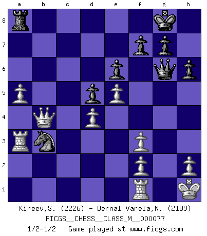 Last move : 1/2-1/2 2017 July 16 16:2:29 [Event "FICGS__CHESS__CLASS_M__000077"] [Site "FICGS"] [Date "2017.04.04"] [Round "1"] [White "Kireev,Sergey"] [Black "Bernal Varela,Nelson"] [Result "1/2-1/2"] [WhiteElo "2226"] [BlackElo "2189"] 1.e4 e6 2.d4 d5 3.Nc3 Nf6 4.Bg5 Bb4 5.e5 h6 6.Bd2 Bxc3 7.Bxc3 Ne4 8.Bb4 c5 9.Bxc5 Nxc5 10.dxc5 O-O 11.Nf3 Nd7 12.Qd4 Qc7 13.b4 b6 14.cxb6 axb6 15.Bd3 Ba6 16.O-O Bxd3 17.cxd3 Rfc8 18.a4 Qc2 19.a5 bxa5 20.bxa5 Rc3 21.Qb4 Nc5 22.d4 Nb3 23.Ra3 Rxf3 24.gxf3 Qg6+ 25.Kh1 Qd3 26.Kg1 Qg6+ 27.Kh1 1/2-1/2 French : MacCutcheon, Lasker variation Kingside Castling by player Black (move 10) Kingside Castling by player White (move 16) This chess game ended in a draw. Follow this game move after move (download)One bad move nullifies forty good ones. (Horowitz) Es genügt nicht ein guter Spieler zu sein, man muß auch gut spielen. (Siegbert Tarrasch) La mitad de las variaciones que son calculadas en una partida de torneo, resultan ser completamente superfluas. Desafortunadamente, nadie sabe por adelantado cual mitad. (Jan Tinman) J'ai toujours senti une vague pitié pour l'homme qui ne connaît rien aux échecs, tout comme j'en aurais pour un homme ignorant de l'amour. Les Echecs, comme la musique ou comme l'amour, ont le pouvoir de rendre heureux. (Siegbert Tarrasch) Life is verb, not a noun. (Charlotte Perkins Gilman)