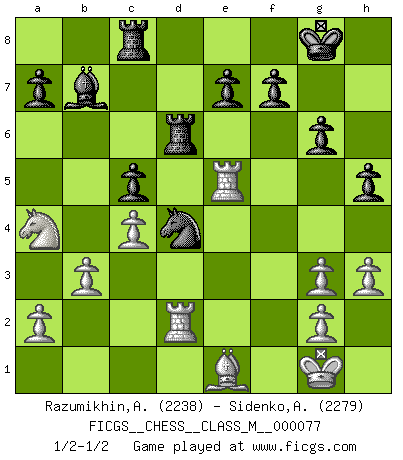 Last move : 1/2-1/2 2017 October 17 9:14:14 [Event "FICGS__CHESS__CLASS_M__000077"] [Site "FICGS"] [Date "2017.04.04"] [Round "1"] [White "Razumikhin,Andrey"] [Black "Sidenko,Anatoly"] [Result "1/2-1/2"] [WhiteElo "2238"] [BlackElo "2279"] 1.e4 c5 2.Nf3 Nc6 3.Bb5 g6 4.Bxc6 bxc6 5.O-O Bg7 6.Re1 Nf6 7.e5 Nd5 8.c4 Nc7 9.d4 cxd4 10.Qxd4 Ne6 11.Qh4 d6 12.exd6 Qxd6 13.Nc3 h5 14.Bd2 Qc7 15.Na4 Bf6 16.Qg3 Qxg3 17.fxg3 Ba6 18.Rac1 c5 19.Bc3 Rc8 20.b3 O-O 21.Ne5 Bxe5 22.Rxe5 Rfd8 23.Rc2 Rd6 24.Rd2 Bb7 25.Rde2 Ba6 26.Be1 Bb7 27.h3 Nd4 28.Rd2 Ne6 29.Rde2 Nd4 30.Rd2 1/2-1/2 Sicilian : Nimzovich-Rossolimo attack (with ...g6, without ...d6) Kingside Castling by player White (move 5) Kingside Castling by player Black (move 20) This chess game ended in a draw. Follow this game move after move (download)A player surprised is half beaten. (Proverb) Gott hat gewollt, dass ich Champion werde. (Surab Azmajparaschvili) Botvinnik trataba de restarle el misterio al Ajedrez, siempre relacionandolo a situaciones de la vida ordinaria. El gustaba de llamar al Ajedrez un típico problema inexacto similar a aquellos de los cuales la gente siempre tiene que enfrentarse en la vida cotidiana. (Garry Kasparov) J'ai vu le vaincu d'Echecs jouer des années durant dans l'espoir de la fête de la victoire. Car tu es plus riche de ce qu'elle existe si même elle n'est point pour toi. Ainsi de la perle du fond des mers. (Antoine de Saint-Exupéry) There are 10 types of people in this world: those who understand binary and those who don't. (Anonymous)
