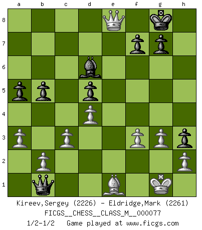 Last move : 1/2-1/2 2017 May 24 12:48:55 [Event "FICGS__CHESS__CLASS_M__000077"] [Site "FICGS"] [Date "2017.04.04"] [Round "1"] [White "Kireev,Sergey"] [Black "Eldridge,Mark"] [Result "1/2-1/2"] [WhiteElo "2226"] [BlackElo "2261"] 1.e4 e5 2.Nf3 Nc6 3.Bb5 a6 4.Ba4 Nf6 5.O-O Be7 6.Re1 b5 7.Bb3 O-O 8.c3 d5 9.exd5 Nxd5 10.Nxe5 Nxe5 11.Rxe5 c6 12.d4 Bd6 13.Re1 Qh4 14.g3 Qh3 15.Qe2 Bg4 16.Qf1 Qh5 17.Nd2 Rae8 18.Rxe8 Rxe8 19.f3 Bh3 20.Qf2 Bf5 21.Nf1 Qg6 22.Bxd5 cxd5 23.Ne3 h5 24.Nxf5 Qxf5 25.Bd2 h4 26.Re1 Rxe1+ 27.Bxe1 h3 28.Qe2 a5 29.a3 Qb1 30.Qe8+ 1/2-1/2 Ruy Lopez : Closed, 7...O-O Kingside Castling by player White (move 5) Kingside Castling by player Black (move 7) This chess game ended in a draw. Follow this game move after move (download)I won't play with you anymore. You have insulted my friend. - When an opponent cursed himself for a blunder. (Miguel Najdorf) Karpov ist ein Museumsstück. (Garry Kasparov) EL Ajedrez es como la vida. (Boris Spassky) Même si vous avez un bon coup à faire, regardez toujours s'il n'y en a pas un qui lui soit préférable. (Pedro Damiano) Warrior pose battles inner weakness and wins focus. You see that there is no war within you. You're on your own side, and you are your own strength. (Terri Guillemets)