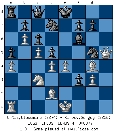 Last move : 1-0 2017 April 9 15:26:31 [Event "FICGS__CHESS__CLASS_M__000077"] [Site "FICGS"] [Date "2017.04.04"] [Round "1"] [White "Ortiz,Clodomiro"] [Black "Kireev,Sergey"] [Result "1-0"] [WhiteElo "2274"] [BlackElo "2226"] 1.Nf3 Nf6 2.c4 c6 3.d4 d5 4.e3 Bf5 5.Nc3 e6 6.Nh4 Bg6 7.Nxg6 hxg6 8.g3 Nbd7 9.a3 Be7 10.c5 e5 11.b4 Qc7 12.Bg2 e4 13.Bd2 g5 14.a4 g4 15.b5 a5 16.b6 Qc8 17.h4 gxh3 18.Rxh3 Rxh3 19.Bxh3 Nh7 20.Qh5 Ng5 21.Bg4 Bf6 22.f4 exf3 23.e4 1-0 Reti Opening Player White won this chess game. Follow this game move after move (download)My opponents make good moves too. Sometimes I don't take these things into consideration. (Bobby Fischer) Ich las kürzlich ein Buch von Nietzsche. Er sagte Religion verdumme nur die Menschen. Ich stimme zu. (Robert James Fischer) En posiciones complicadas, Bobby Fischer pocas veces tuvo que temer de cualquiera. (Paul Keres) L'attaque fait le spectacle, la défense gagne les matchs. (Dicton footballistique) Gambling : The sure way of getting nothing from something. (Wilson Mizner)