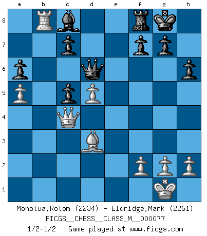 Last move : 1/2-1/2 2017 July 9 7:26:45 [Event "FICGS__CHESS__CLASS_M__000077"] [Site "FICGS"] [Date "2017.04.04"] [Round "1"] [White "Monotua,Rotom"] [Black "Eldridge,Mark"] [Result "1/2-1/2"] [WhiteElo "2234"] [BlackElo "2261"] 1.e4 e5 2.Nf3 Nc6 3.Bc4 Bc5 4.b4 Bxb4 5.c3 Ba5 6.d4 d6 7.Qb3 Qd7 8.O-O Bb6 9.Bb5 a6 10.Ba4 Ba7 11.Qb2 b5 12.Bc2 Rb8 13.Be3 Qe7 14.a4 b4 15.a5 bxc3 16.Qxc3 Nxd4 17.Bxd4 exd4 18.Nxd4 Bxd4 19.Qxd4 Nf6 20.Nc3 O-O 21.Nd5 Nxd5 22.exd5 Rb5 23.Bd3 Rc5 24.Rfc1 Rd8 25.Rxc5 dxc5 26.Qc4 h6 27.Rb1 Qd6 28.Rb8 Rf8 1/2-1/2 Evans gambit : Tartakower attack Kingside Castling by player White (move 8) Kingside Castling by player Black (move 20) This chess game ended in a draw. Follow this game move after move (download)Mistrust is the most necessary characteristic of the Chess player. (Siegbert Tarrasch) Immer nach dem besten Zug zu suchen ist ziemlich unpraktisch. (Nigel Short) El Ajedrez tiene tanto misterio como las mujeres. (Purdy) Seul un grand joueur sait à quel point il joue faiblement. (Xavier Tartacover) I don't know, I don't care, and it doesn't make any difference. (Albert Einstein)