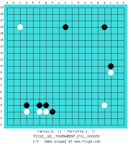 Last move : 1-0 2007 May 28 17:24:16 [Event "FICGS__GO__TOURNAMENT_KYU__000028"] [Site "FICGS"] [Date "2007.04.05"] [Round "1"] [Black "Yarkov,Evgeny"] [White "Perrotta,John Zach"] [Result "1-0"] 1.q16 q4 2.d4 c16 3.k16 r9 4.r10 f3 5.f4 d3 6.g4 g3 7.h3 1-0 This go game has been lost on time (started : 2007.04.05 3:15:26) Here are the names of the openings (joseki) played in the four corners : Corner d4 : d4 f3 Hoshi (Hwajeom, Seongjeom, Xingwei`) 4-4 Point. The star or hoshi (4-4) point, emphasizing influence at the potential expense of territory. Ikken Kakari (Hankan Keolch'im, Yi Gua`jiao~, 1-Space Low Approach). White 2 is the standard approach move to the 4-4. Player Black won this Go (weiqi, baduk) game. Follow this game move after move (download)The intersection is rarely neutral. (Pierre Audouard) If computers get too powerful, we can organize them into committees. That'll do them in. (Anonymous)