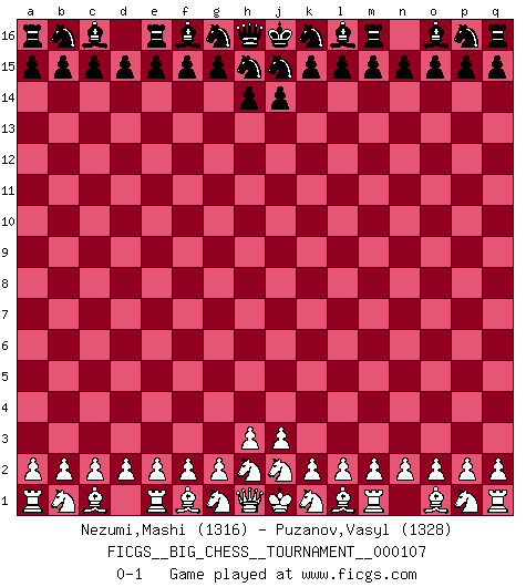 Last move : 0-1 2017 May 5 2:37:49 [Event "FICGS__BIG_CHESS__TOURNAMENT__000107"] [Site "FICGS"] [Date "2017.04.05"] [Round "1"] [White "Nezumi,Mashi"] [Black "Puzanov,Vasyl"] [Result "0-1"] [WhiteElo "1316"] [BlackElo "1328"] 0-1 This big chess game has been lost on time (started : 2017.04.05 2:18:52) Follow this game move after move (download)Life is a kind of Chess, with struggle, competition, good and ill events. (Benjamin Franklin) Woher wissen wir, daß der Neanderthaler Blindschach gespielt hat? -- Bei Ausgrabungen wurden keine Schachbretter und Figuren gefunden. (Anonymous) Nunca nadie ha ganado una partida de Ajedrez rindiendose. (Unknown) Les Echecs, c'est l'art de la guerre sans les charniers, c'est la résurrection des morts tombés au champ d'honneur, l'espoir perpétuel, la suprématie de l'intelligence sur la force, la culture de l'esprit. (F. Szpiner) There's no money in correspondence chess. (John Knudsen)