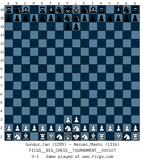 Last move : 0-1 2017 May 5 2:37:49 [Event "FICGS__BIG_CHESS__TOURNAMENT__000107"] [Site "FICGS"] [Date "2017.04.05"] [Round "1"] [White "Gunduz,Can"] [Black "Nezumi,Mashi"] [Result "0-1"] [WhiteElo "1285"] [BlackElo "1316"] 0-1 This big chess game has been lost on time (started : 2017.04.05 2:18:52) Follow this game move after move (download)As one by one I mowed them down, my superiority soon became apparent. (Jose Capablanca) Wenn ein Kopf und ein Buch zusammenstoßen und es klingt hohl, ist es denn allemal im Buche? (Georg Christoph Lichtenberg) Tu eres para mi la Reina en d8 y yo soy el Peón en d7!!. (GM Eduard Gufeld) Vous savez, camarade Pachman, je n'éprouve pas de plaisir à être ministre, je jouerais plutôt aux échecs comme vous, ou alors ferais une révolution au Venezuela. (Che Guevara à Ludek Pachman, 'Checkmate in Prague', 1975) Men should grow up. - Yeah. And dogs should stop licking themselves. It's not gonna happen. (Gregory House to Dr. Cameron, House M.D.)