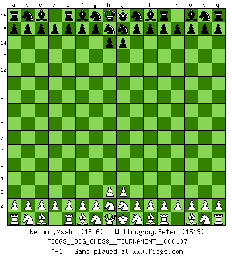 Last move : 0-1 2017 May 5 2:37:49 [Event "FICGS__BIG_CHESS__TOURNAMENT__000107"] [Site "FICGS"] [Date "2017.04.05"] [Round "1"] [White "Nezumi,Mashi"] [Black "Willoughby,Peter"] [Result "0-1"] [WhiteElo "1316"] [BlackElo "1519"] 0-1 This big chess game has been lost on time (started : 2017.04.05 2:18:52) Follow this game move after move (download)When you absolutely don't know what to do anymore, it is time to panic. (John van der Wiel) Versuche, dich von der Sklaverei der Eröffnungsvarianten zu befreien. Stattdessen soll man gewisse Typenpositionen erlernen, die man eingehend analysiert. (Aaron Nimzowitsch) Sin errores no puede haber brillantez. (Emanuel Lasker) Il n'y a plus de joueurs du niveau de Jacob Murray dont la seule quête est le beau jeu, le plaisir de voir les pièces construire quelque chose. Sur 10 idées à la minute, 9 seront sans intérêt, la dernière s'avèrera géniale. (Christian Bauer) Never was anything great achieved without danger. (Niccolo Machiavelli)