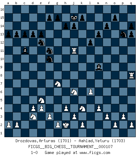 Last move : 1-0 2017 July 9 20:52:42 [Event "FICGS__BIG_CHESS__TOURNAMENT__000107"] [Site "FICGS"] [Date "2017.04.05"] [Round "1"] [White "Drozdovas,Arturas"] [Black "Aahlad,Yeturu"] [Result "1-0"] [WhiteElo "1701"] [BlackElo "1703"] 1.j2-k4 m15-m13 2.h1-o7 h15-g13 3.d2-d4 e15-e13 4.c1-f4 j15-k13 5.f4-e5 d15-d13 6.e2-e4 h16-n11 7.g1-f3 l16-p12 8.o7-p7 q15-q13 9.m2-m4 c16-l8 10.p1-o3 e16-e14 11.b1-d2 p16-o14 12.l1-p5 e14-b14 13.f1-c4 f16-c13 14.n2-n3 q16-q14 15.e5-k10 g13-e12 16.k10-l9 n11-b11 17.l9-q14 p15-q14 18.a1-b1 o16-p15 19.p7-f7 g16-f14 20.f7-b11 b14-b11 21.k1-l3 b16-c14 22.l3-j4 m16-m14 23.j4-g5 c13-k6 24.h3-h4 m14-l14 25.l2-l4 l8-m7 26.k4-h3 n15-n14 27.l4-l5 k6-h8 28.o3-n5 m7-n8 29.g5-f7 h8-g7 30.f3-e5 l14-l10 31.d2-f3 l10-c10 32.c4-b3 o14-n12 33.o1-l4 p15-k10 34.p5-k10 g7-k10 35.m1-m3 k16-h15 36.q1-m1 j16-j15 37.m1-l1 k10-g7 38.m3-k3 a16-p16 39.p2-p3 p12-l8 40.k3-k8 n8-m9 41.n5-l6 p16-p7 42.h3-k4 h15-j13 43.h2-j4 c14-d12 44.j4-g5 f14-g12 45.l4-j6 l8-j6 46.k4-j6 g7-b12 47.l6-k4 j13-h11 48.l5-l6 k13-h12 49.f7-h8 d12-f11 50.b3-f7 p7-f7 51.h8-f7 c10-c2 52.e5-d3 h11-f10 53.f3-e5 h12-g10 54.g5-e6 c2-c9 55.e1-c1 b11-c11 56.j1-h2 c9-c1 57.b1-c1 a15-a13 58.c1-c11 b12-c11 59.l1-l5 l15-l13 60.l5-p5 n12-p13 61.k8-m8 m9-l10 62.f2-f3 b15-b13 63.p5-p10 g12-j11 64.f7-h8 g10-h8 65.m8-h8 c15-c13 66.e6-g7 l10-k11 67.p10-p11 l13-l12 68.h8-q8 k11-m9 69.p11-j11 1-0 Follow this game move after move (download)Fischer was a master of clarity and a king of artful positioning. His opponents would see where he was going but were powerless to stop him. (Bruce Pandolfini) Es genügt nicht ein guter Spieler zu sein, man muß auch gut spielen. (Siegbert Tarrasch) Un buen sacrificio es aquel que aunque no sea necesariamente sólido, deja a tu oponente aturdido y confuso. (Rudolph Spielmann) Echiquier : carré parfait, comme la Jérusalem nouvelle décrite par l'auteur de l'Apocalypse, huit cases sur huit, exaltation du chiffre 4, symbole du cosmos aux quatre horizons... où le noir et le blanc, l'ombre et la lumière, le mal et le bien s'entremêlent et se conjuguent. (Robert Couffignal, Le Gambit du poète) For peace of mind, resign as general manager of the universe. (Douglas Adams)