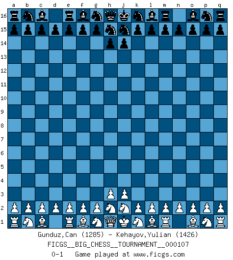 Last move : 0-1 2017 May 5 2:37:49 [Event "FICGS__BIG_CHESS__TOURNAMENT__000107"] [Site "FICGS"] [Date "2017.04.05"] [Round "1"] [White "Gunduz,Can"] [Black "Kehayov,Yulian"] [Result "0-1"] [WhiteElo "1285"] [BlackElo "1426"] 0-1 This big chess game has been lost on time (started : 2017.04.05 2:18:52) Follow this game move after move (download)I prefer to lose a really good game than to win a bad one. (David Levy) Schach ist ein schwarz-weisser Dschungel. (Garry Kasparov) El ganador de una partida es aquel jugador que hace el penúltimo error. (Savielly Tartakover) Nous vivons dans un monde échiquéen : chaque jour qui passe est un défi à relever. (Philosophe Sasha) I teach you to lie, cheat and steal, and as soon as my back's turned you wait in line ? (Gregory House, House M.D.)