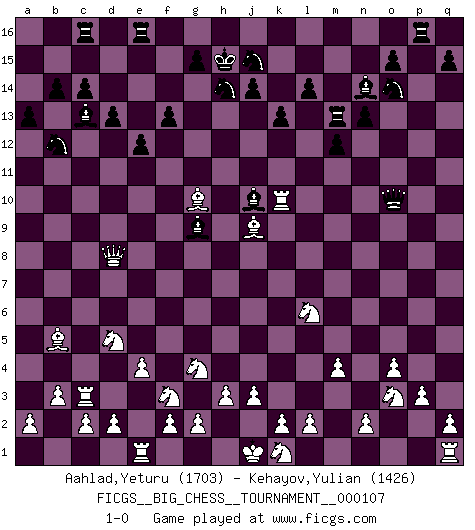 Last move : 1-0 2017 August 17 4:1:17 [Event "FICGS__BIG_CHESS__TOURNAMENT__000107"] [Site "FICGS"] [Date "2017.04.05"] [Round "1"] [White "Aahlad,Yeturu"] [Black "Kehayov,Yulian"] [Result "1-0"] [WhiteElo "1703"] [BlackElo "1426"] 1.m2-m4 j15-k13 2.e2-e4 h15-g13 3.j2-k4 h16-o10 4.h2-g4 m15-m13 5.f1-b5 g16-j15 6.h1-p8 k16-h15 7.b2-b3 n15-n13 8.c1-b2 m13-m12 9.l1-p5 e15-e13 10.p2-p3 d15-d13 11.o1-p2 e13-e12 12.b1-c3 o16-g9 13.o2-o4 p16-o14 14.p8-p15 l16-n14 15.p15-p7 c16-j10 16.c3-d5 b16-c14 17.b2-j9 a16-c16 18.p2-g10 f16-c13 19.p1-o3 f15-f13 20.g1-f3 h15-j13 21.e1-e3 l15-l14 22.e3-c3 c14-b12 23.m1-m3 b15-b14 24.a1-e1 j16-h15 25.k4-l6 q16-p16 26.p7-a7 a15-a13 27.p5-g13 h14-g13 28.a7-g13 k13-h14 29.g13-j13 m16-m13 30.j13-d8 c15-c14 31.m3-k3 k15-k13 32.k3-k10 1-0 This big chess game has been lost on time (started : 2017.04.05 2:18:52) Follow this game move after move (download)I'm not afraid of Spassky. The world knows I'm the best. You don't need a match to prove it. (Bobby Fischer) Am wohlsten fühle ich mich, wenn ich sehe, wie sich mein Gegner im Todeskampf windet. (Robert James Fischer) El muchacho (en ese entonces un niño de 12 años llamado Anatoly Karpov) no tiene ni idea de lo que es el Ajedrez y no hay futuro en absoluto para el en esta profesión. (Mikhail Botvinnik) La vie et les Echecs sont tous les deux une lutte constante. (Lasker) Train yourself to let go of everything you fear to lose. (Master Yoda in Star Wars ep.3)