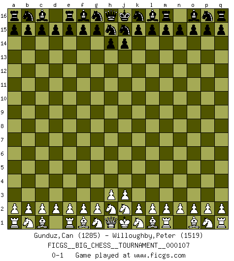 Last move : 0-1 2017 May 5 2:37:49 [Event "FICGS__BIG_CHESS__TOURNAMENT__000107"] [Site "FICGS"] [Date "2017.04.05"] [Round "1"] [White "Gunduz,Can"] [Black "Willoughby,Peter"] [Result "0-1"] [WhiteElo "1285"] [BlackElo "1519"] 0-1 This big chess game has been lost on time (started : 2017.04.05 2:18:52) Follow this game move after move (download)Tactics flow from a superior position. (Bobby Fischer) Ich kenne keine einzige Person, die behaupten würde, Garri Kasparow sei ein guter Mensch (Nigel Short) Prefiero perder una partida realmente buena, que ganar una mala. (David Levy) Il vaut toujours mieux jouer un plan faux de façon logique que de n'avoir pas de plan du tout. (Victor Kortchnoï) If only faces could talk... (Pat Summerall, Sportscaster during the Super Bowl)