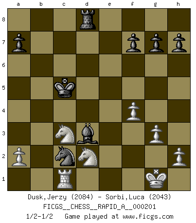 Last move : 1/2-1/2 2017 June 18 21:50:53 [Event "FICGS__CHESS__RAPID_A__000201"] [Site "FICGS"] [Date "2017.04.10"] [Round "1"] [White "Dusk,Jerzy"] [Black "Sorbi,Luca"] [Result "1/2-1/2"] [WhiteElo "2084"] [BlackElo "2043"] 1.d4 Nf6 2.c4 e6 3.Nf3 b6 4.g3 Ba6 5.Qc2 Bb7 6.Bg2 c5 7.d5 exd5 8.cxd5 Nxd5 9.O-O Be7 10.Ne5 Qc7 11.Qe4 Nc6 12.Qxd5 Nd8 13.Qxd7+ Qxd7 14.Nxd7 Bxg2 15.Nxb6 Bxf1 16.Nxa8 Bxe2 17.Nc7+ Kd7 18.Nd5 Bd6 19.Ndc3 Bd3 20.Be3 Ne6 21.Nd2 Rb8 22.b3 Kc6 23.f4 Nd4 24.Rc1 Rd8 25.b4 Nc2 26.Bxc5 Bxc5+ 27.bxc5 Kxc5 1/2-1/2 Queen's Indian : Nimzovich variation (exaggerated Fianchetto) Kingside Castling by player White (move 9) This chess game ended in a draw. Follow this game move after move (download)It is difficult to play against Einstein's theory --on his first loss to Fischer. (Mikhail Tal) Wenn man heute mit 14 Jahren noch kein GM ist, kann man es vergessen. (Viswanathan Anand) No es tiempo de jugar al Ajedrez cuando la casa esta en llamas. (Proverbio Italiano) Les sacrifices démontrent seulement que quelqu'un a gaffé. (Savielly Tartacover) Fame, I have already. Now I need the money. (an elderly Steinitz)