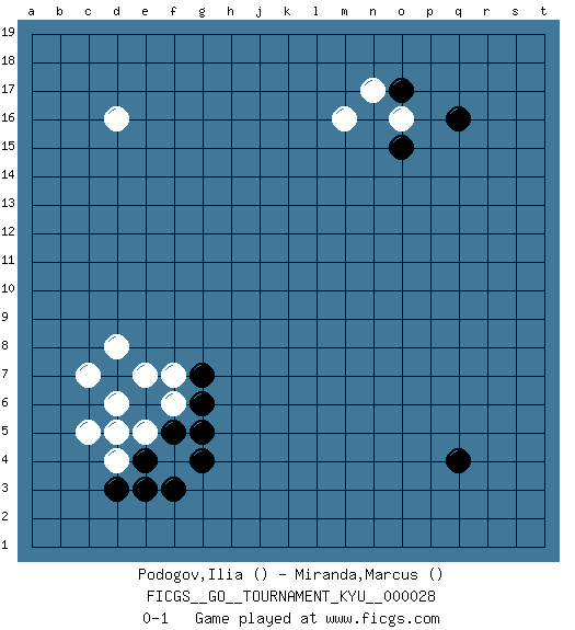 Last move : 0-1 2007 May 22 4:32:10 [Event "FICGS__GO__TOURNAMENT_KYU__000028"] [Site "FICGS"] [Date "2007.04.05"] [Round "1"] [Black "Podogov,Ilia"] [White "Miranda,Marcus"] [Result "0-1"] 1.q4 d16 2.q16 d4 3.e4 c5 4.d3 e5 5.e6 d6 6.f5 d5 7.d7 f4 8.e3 f6 9.g5 e7 10.f3 d8 11.g4 c7 12.g7 f7 13.g6 o16 14.o15 m16 15.o17 n17 0-1 This go game has been lost on time (started : 2007.04.05 3:15:26) Here are the names of the openings (joseki) played in the four corners : Corner d4 : d4 e4 Hoshi (Hwajeom, Seongjeom, Xingwei`) 4-4 Point. The star or hoshi (4-4) point, emphasizing influence at the potential expense of territory. Corner q16 : q16 o16 Hoshi (Hwajeom, Seongjeom, Xingwei`) 4-4 Point. The star or hoshi (4-4) point, emphasizing influence at the potential expense of territory. Ikken Takagakari (Hankan Nop'dakeolch'im, Yi Gaojia, 1-Space High Approach). Black typically responds at 6-4 or 3-10. Black 4-10 is played when Black finds play on the right side advantageous. Black 4-8 or 3-8 may be played when Black has support at top. Player White won this Go (weiqi, baduk) game. Follow this game move after move (download)If you lose by one point, take a rest. (Anonymous) Difficult things take a long time, impossible things a little longer. (Author unknown)