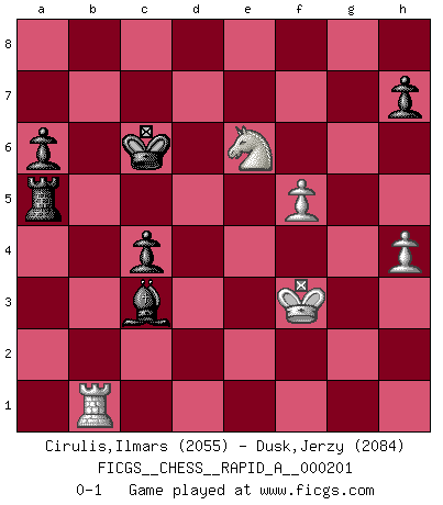 Last move : 0-1 2017 June 11 1:53:53 [Event "FICGS__CHESS__RAPID_A__000201"] [Site "FICGS"] [Date "2017.04.10"] [Round "1"] [White "Cirulis,Ilmars"] [Black "Dusk,Jerzy"] [Result "0-1"] [WhiteElo "2055"] [BlackElo "2084"] 1.b4 d5 2.Bb2 Bg4 3.h3 Bh5 4.a3 e6 5.c4 dxc4 6.Qc1 Nf6 7.Qxc4 Nbd7 8.e3 Nb6 9.Qb3 Be7 10.Be2 Bxe2 11.Nxe2 Qd5 12.Qxd5 Nbxd5 13.O-O O-O 14.Bxf6 Nxf6 15.Nbc3 g6 16.Rfb1 Kg7 17.Nc1 Rfc8 18.d4 b6 19.g3 c5 20.dxc5 bxc5 21.b5 Bd8 22.N1e2 a6 23.a4 Ba5 24.Rd1 Kf8 25.e4 Ke7 26.e5 Nd7 27.f4 f6 28.exf6+ Nxf6 29.Kg2 Bb4 30.b6 Rc6 31.a5 Rd6 32.Kf2 Rf8 33.Kf3 Rfd8 34.Rxd6 Kxd6 35.Ne4+ Nxe4 36.Kxe4 Kc6 37.g4 Rd2 38.Ke3 Rb2 39.h4 Rb3+ 40.Kf2 Ra3 41.Rb1 Rxa5 42.Nd4+ Kxb6 43.Nxe6 Kc6 44.f5 gxf5 45.gxf5 Bc3 46.Kf3 c4 0-1 Polish (Sokolsky) opening Kingside Castling by player White (move 13) Kingside Castling by player Black (move 13) Player Black won this chess game. Follow this game move after move (download)Chess teaches you to control the initial excitement you feel when you see something that looks good and it trains you to think objectively when you're in trouble. (Stanley Kubrick) Capablanka war das größte Genie der Schachgeschichte! Aber denken sie nicht er habe nichts vom Schach verstanden. Er wusste nur soviel wie er wissen musste um seine Ziele zu erreichen. (Mikhail Moiseyevich Botvinik) Yo he agregado estos principios a la ley: pongan los Caballos en acción antes de que los dos Alfiles sean desarrollados. (Emanuel Lasker) Aucun coup ne doit être joué sans but. (Pedro Damiano) An expert is a man who has made all the mistakes which can be made in a very narrow field. (Niels Bohr)