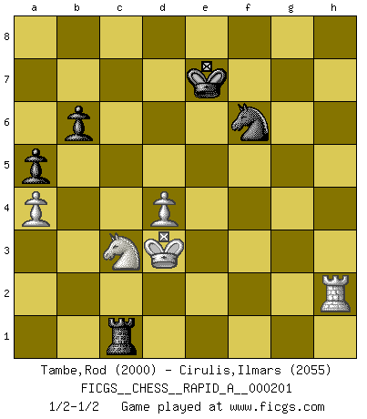 Last move : 1/2-1/2 2017 August 16 22:11:45 [Event "FICGS__CHESS__RAPID_A__000201"] [Site "FICGS"] [Date "2017.04.10"] [Round "1"] [White "Tambe,Rod"] [Black "Cirulis,Ilmars"] [Result "1/2-1/2"] [WhiteElo "2000"] [BlackElo "2055"] 1.d4 e6 2.c4 Nf6 3.Nf3 b6 4.a3 Bb7 5.Nc3 d5 6.Bf4 Bd6 7.Bg5 h6 8.Bh4 dxc4 9.e3 Nbd7 10.Bxc4 O-O 11.Qc2 Be7 12.O-O Nd5 13.Bxe7 Qxe7 14.Bxd5 exd5 15.b4 Rfc8 16.b5 c6 17.bxc6 Bxc6 18.Qb3 a6 19.a4 Bb7 20.h3 Rc4 21.Nd2 Qb4 22.Qxb4 Rxb4 23.Rfb1 a5 24.Ra3 Rc8 25.Rab3 Rxb3 26.Rxb3 h5 27.h4 f6 28.Kh2 Kf7 29.f3 g5 30.Kg3 Kg6 31.e4 dxe4 32.fxe4 Ba6 33.Ra3 gxh4+ 34.Kxh4 Bb7 35.Rb3 Ba8 36.g3 Bb7 37.g4 hxg4 38.Kxg4 Bxe4 39.Ndxe4 f5+ 40.Kf3 fxe4+ 41.Kxe4 Kf7 42.Kd3 Ke6 43.Ne4 Rc1 44.Nc3 Kd6 45.Rb2 Rf1 46.Ne4+ Ke6 47.Kc4 Rc1+ 48.Nc3 Kd6 49.Rg2 Nf6 50.Kb3 Rh1 51.Rg6 Ke6 52.Kc4 Rc1 53.Kd3 Kf7 54.Rg2 Ke6 55.Rh2 Kd6 56.Rh6 Ke7 57.Rh2 1/2-1/2 Queen's pawn Kingside Castling by player Black (move 10) Kingside Castling by player White (move 12) 10 pieces endgame at move 41 : White KRNPP , Black KRNPP WHITE : King + 1 Rook 1 Knight 2 Pawns BLACK : King + 1 Rook 1 Knight 2 Pawns This chess game ended in a draw. Follow this game move after move (download)Chess is a terrible game. If you have no center, your opponent has a freer position. If you do have a center, then you really have something to worry about ! (Siegbert Tarrasch) Die Idee von Capablanca, Schach als Fach in den Schulen zu lehren, ist großartig. (Fidel Castro) El Ajedrez es el juego mas altamente simbólico, pero las agresiones estan por lo tanto aún mas francamente representadas en la partida. Tal vez comenzo como un juego de guerra; Algo como la representación de una batalla en miniatura entre las fuerzas de dos reinos. (Karl Meninger) Le joueur d'Echecs qui veut atteindre le top est obligé de développer son propre credo créatif. Alexeï Stepanovicth Souétine. Il est facile d'écrire des livres ! Ce qui est difficile, c'est de jouer ! (Alexeï Stepanovicth Souétine) Happy endings are just stories that haven't finished yet. (Jane Smith in Mr & Mrs Smith)