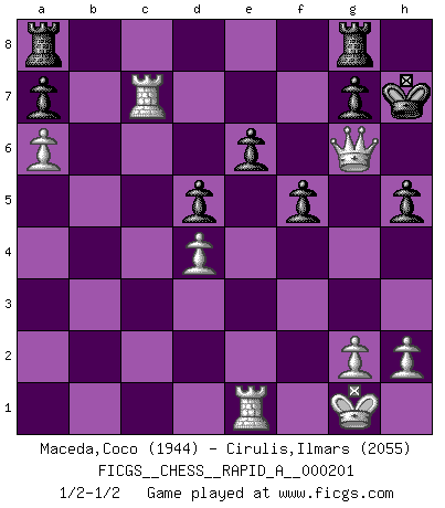 Last move : 1/2-1/2 2017 August 3 1:30:37 [Event "FICGS__CHESS__RAPID_A__000201"] [Site "FICGS"] [Date "2017.04.10"] [Round "1"] [White "Maceda,Coco"] [Black "Cirulis,Ilmars"] [Result "1/2-1/2"] [WhiteElo "1944"] [BlackElo "2055"] 1.e4 e6 2.d4 d5 3.Nc3 Bb4 4.e5 Ne7 5.a3 Bxc3+ 6.bxc3 b6 7.Qg4 Kf8 8.Nf3 Ba6 9.Bd3 Bxd3 10.cxd3 h5 11.Qf4 Ng6 12.Qd2 c5 13.O-O Nc6 14.dxc5 Ncxe5 15.Nxe5 Nxe5 16.cxb6 Qxb6 17.Qe2 f6 18.Bf4 Ng6 19.Be3 Qc6 20.Rfb1 Qxc3 21.a4 Ne7 22.a5 Kf7 23.a6 Kg6 24.Rc1 Qe5 25.f4 Qd6 26.Bc5 Qd7 27.Bxe7 Qxe7 28.f5+ Kxf5 29.Qf3+ Kg6 30.Qg3+ Kh7 31.Rc7 Qf8 32.d4 Rg8 33.Rf1 f5 34.Qg5 Qe8 35.Re1 Qg6 36.Qxg6+ 1/2-1/2 French : Winawer, Advance variation Kingside Castling by player White (move 13) This chess game ended in a draw. Follow this game move after move (download)Life is like a game of Chess, changing with each move. (Chinese proverb) Computer sind die einzigen Gegner, die nicht immer eine Ausrede auf Lager haben, wenn sie gegen mich verlieren. (Robert James Fischer) Si no le temes a Spassky, entonces elimino el elemento del dinero. (Jim Slater) Vous m'avez demandé de vous exposer quel est le fondement de la prière. Je ne fais que préparer les pièces du jeu sur la table... Nous sera-t-il permis d'en adopter les règles et si nous les appliquons scrupuleusement nous ne tarderons pas à faire mat le Roi divin ! Il ne pourra échapper à nos mains. (Sainte Thérèse d'Avila, Chemin de perfection) The production of too many useful things results in too many useless people. (Karl Marx)
