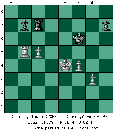 Last move : 1-0 2017 April 27 20:48:18 [Event "FICGS__CHESS__RAPID_A__000201"] [Site "FICGS"] [Date "2017.04.10"] [Round "1"] [White "Cirulis,Ilmars"] [Black "Daanen,Aard"] [Result "1-0"] [WhiteElo "2055"] [BlackElo "2049"] 1.b4 e5 2.a3 g6 3.Bb2 Bg7 4.Nf3 d6 5.e3 Nf6 6.Be2 O-O 7.O-O a5 8.c4 axb4 9.axb4 Rxa1 10.Bxa1 e4 11.Nd4 c5 12.bxc5 dxc5 13.Nb5 Nc6 14.Bxf6 Qxf6 15.N1c3 Qe5 16.Qb1 f5 17.Nd5 Rd8 18.Rd1 Bf8 19.d4 exd3 20.Qxd3 Be6 21.g3 Bf7 22.Bf3 Kh8 23.Qb3 g5 24.Nbc3 Nb4 25.Qa4 f4 26.Qa5 Re8 27.exf4 gxf4 28.Qb5 fxg3 29.hxg3 Rb8 30.Kg2 Nc2 31.Ne2 Bg6 32.Ndf4 Be4 33.Bxe4 Qxe4+ 34.Kg1 Re8 35.Qb6 Kg8 36.Qf6 Bg7 37.Qg5 Nd4 38.Nxd4 cxd4 39.Nh5 Qg6 40.Qd5+ Qf7 41.Qxf7+ Kxf7 42.Nxg7 Kxg7 43.Rxd4 Rb8 44.Rd7+ Kg6 45.Rd6+ Kg7 46.Rb6 Kg8 47.c5 Rc8 48.Rb5 Rc7 49.Kg2 Kf7 50.Kf3 Ke6 51.Ke4 Kf6 52.f4 1-0 Polish (Sokolsky) opening Kingside Castling by player Black (move 6) Kingside Castling by player White (move 7) 10 pieces endgame at move 42 : White KRPPP , Black KRPPP WHITE : King + 1 Rook 3 Pawns BLACK : King + 1 Rook 3 Pawns 9 pieces endgame at move 43 : White KRPPP , Black KRPP WHITE : King + 1 Rook 3 Pawns BLACK : King + 1 Rook 2 Pawns Player White won this chess game. Follow this game move after move (download)Avoid the crowd. Do your own thinking independently. Be the Chess player, not the Chess piece. (Ralph Charell) Im Wettkampf zwischen starken Meistern kommen Fehler sehr selten vor, deshalb ist es mit bloßem Warten nicht getan. (José Raúl Capablanca) Un sacrificio se refuta mucho mejor al aceptarlo. (Wilhelm Steinitz) Les écrivains ont utilisé les échecs pour analyser les côtés extrêmes de la nature humaine. Dans ce cadre, les échecs offrent un champ d'expérimentation idéal. Mais on pourrait faire la même chose avec la peinture. Et là, en vous référant à Van Gogh, vous ne tirerez pas de conclusion définitive sur les peintres. (Gary Kasparov) A shortcut is the longest distance between two points. (Don Groves)