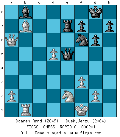 Last move : 0-1 2017 May 16 19:58:6 [Event "FICGS__CHESS__RAPID_A__000201"] [Site "FICGS"] [Date "2017.04.10"] [Round "1"] [White "Daanen,Aard"] [Black "Dusk,Jerzy"] [Result "0-1"] [WhiteElo "2049"] [BlackElo "2084"] 1.d4 Nf6 2.c4 e6 3.Nc3 Bb4 4.e3 O-O 5.Bd3 d5 6.cxd5 exd5 7.Nge2 Re8 8.Bd2 Bd6 9.Rc1 a6 10.O-O Nbd7 11.f3 b5 12.e4 c5 13.Bb1 dxe4 14.Nxe4 Nxe4 15.Bxe4 Ra7 16.Re1 c4 17.b3 cxb3 18.Qxb3 Nf6 19.Qd3 Be6 20.Bc6 Bc4 21.Rxc4 bxc4 22.Qxc4 Rc7 23.Qa4 Bxh2+ 24.Kf1 Re6 25.Ba5 g6 26.Rb1 Qe7 27.Bxc7 Bxc7 28.Qc4 Qd6 29.d5 Re7 30.Bb7 Qe5 31.Qxa6 Bb8 0-1 Nimzo-Indian : 4.e3 O-O, 5.Bd3 d5 Kingside Castling by player Black (move 4) Kingside Castling by player White (move 10) Player Black won this chess game. Follow this game move after move (download)Via the squares on the chessboard, the Indians explain the movement of time and the age, the higher influences which control the world and the ties which link Chess with the human soul. (Al-Masudi) Ein Großmeister muß tausende Partien in seinem Kopf speichern, denn diese sind für Ihn, was die Worte der Muttersprache für gewöhnliche Leute sind, oder Noten für Musiker... (Garry Kasparov) La vida es como el Ajedrez, con lucha, competición y eventos buenos y malos. (Benjamin Franklin) Le profane ne songe pas à la somme de jouissance dont il se prive, qui méconnaît ce jeu aux ressources aussi variées que passionnantes. (Jean-Marie Jeanton-Lamarche) Two beer, or not two beer. (Unknown)