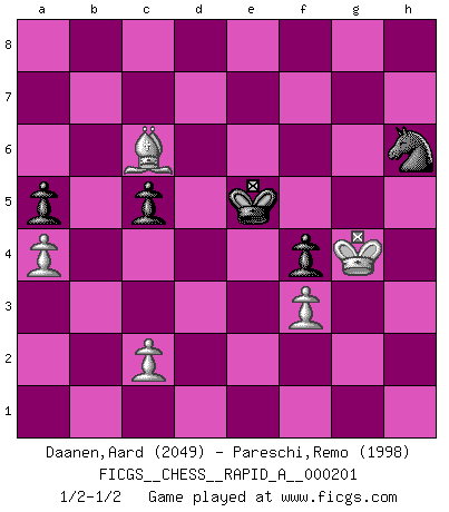 Last move : 1/2-1/2 2017 August 4 21:12:21 [Event "FICGS__CHESS__RAPID_A__000201"] [Site "FICGS"] [Date "2017.04.10"] [Round "1"] [White "Daanen,Aard"] [Black "Pareschi,Remo"] [Result "1/2-1/2"] [WhiteElo "2049"] [BlackElo "1998"] 1.e4 e5 2.f4 exf4 3.Bc4 Nc6 4.d4 Nf6 5.Nc3 Bb4 6.Nge2 f3 7.gxf3 d5 8.exd5 Nxd5 9.O-O Nxc3 10.bxc3 Bd6 11.Ng3 Ne7 12.Ne4 O-O 13.Kh1 Ng6 14.Rg1 Kh8 15.Qf1 b6 16.Be3 Bb7 17.Re1 Qh4 18.Qg2 Rae8 19.Bd2 Bf4 20.Bxf4 Qxf4 21.Bb5 Re7 22.Qg3 a6 23.Bd3 Rfe8 24.Ref1 Rd8 25.Re1 f6 26.Rgf1 a5 27.Bb5 Qh6 28.Bd3 Bc6 29.Qf2 Rde8 30.c4 f5 31.Nd2 Rxe1 32.Rxe1 Qf4 33.Rf1 Re7 34.d5 Ba4 35.Nb3 Ne5 36.Nd4 Bd7 37.Ne2 Qh6 38.Ng3 f4 39.Ne4 Qh5 40.Be2 Bh3 41.Rg1 Nd7 42.Bd3 Re5 43.a4 Kg8 44.Qe2 h6 45.Qf2 g5 46.Rd1 Bf5 47.d6 c6 48.Re1 Qf7 49.Qd2 Qe6 50.Kg2 Bxe4 51.Rxe4 Kg7 52.c5 Nxc5 53.Rxe5 Qxe5 54.Be4 Nb7 55.d7 Nd8 56.Qf2 Qc5 57.Qxc5 bxc5 58.Kh3 h5 59.Kg2 Kf6 60.h4 gxh4 61.Kh3 Ke6 62.Kxh4 Kxd7 63.Kxh5 Ke6 64.Kg5 Ke5 65.Kg4 Nf7 66.Bxc6 Nh6+ 1/2-1/2 KGA : Bishop's gambit, Maurian defense Kingside Castling by player White (move 9) Kingside Castling by player Black (move 12) 10 pieces endgame at move 66 : White KBPPP , Black KNPPP WHITE : King + 1 Bishop 3 Pawns BLACK : King + 1 Knight 3 Pawns This chess game ended in a draw. Follow this game move after move (download)There are tough players and nice guys, and I'm a tough player. (Bobby Fischer) Es genügt nicht ein guter Spieler zu sein, man muß auch gut spielen. (Siegbert Tarrasch) El Ajedrez, como cualquier actividad creativa, solo puede existir a través del esfuerzo combinado de aquellos que tienen talento creativo y de aquellos que poseen la habilidad de organizar su trabajo creativo. (Mikhail Botvinnik) Les échecs, c'est l'imagination. (David Bronstein) All politicians must be presumed guilty until they are proven innocent. (Dinesh De Silva)