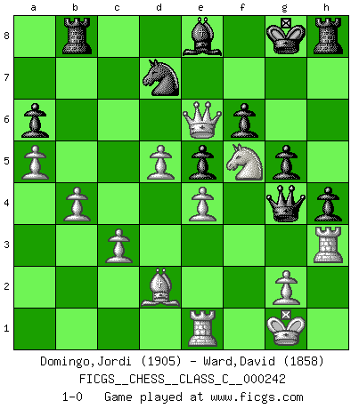 Last move : 1-0 2017 December 3 23:36:38 [Event "FICGS__CHESS__CLASS_C__000242"] [Site "FICGS"] [Date "2017.04.10"] [Round "1"] [White "Domingo,Jordi"] [Black "Ward,David"] [Result "1-0"] [WhiteElo "1905"] [BlackElo "1858"] 1.e4 e5 2.Nf3 Nc6 3.Bc4 Bc5 4.c3 Qe7 5.d4 Bb6 6.O-O d6 7.a4 a6 8.d5 Nb8 9.a5 Ba7 10.Nbd2 Bg4 11.Re1 Nd7 12.h3 Bh5 13.Nf1 h6 14.Ng3 Bg6 15.Qb3 Rb8 16.Qc2 Ngf6 17.Nh4 O-O 18.Nhf5 Qd8 19.Qe2 Kh7 20.b4 Ng8 21.Bd3 f6 22.h4 Ne7 23.Nxe7 Qxe7 24.h5 Be8 25.Nf5 Qf7 26.Bxa6 Bxf2+ 27.Qxf2 bxa6 28.Qa7 Qxh5 29.Qxc7 Qg4 30.Bd2 h5 31.Re3 h4 32.Rh3 g5 33.Re1 Rh8 34.Qxd6 Kg8 35.Qe6+ 1-0 Giuoco Piano : centre-hOlding variation Kingside Castling by player White (move 6) Kingside Castling by player Black (move 17) Player White won this chess game. Follow this game move after move (download)The isolated Pawn casts gloom over the entire chessboard. (Aaron Nimzovich) Wir können eben der zündenden Macht des Opfers nicht wiederstehen, denn die Begeisterung für das Opfer liegt in der Natur des Menschen. (Rudolf Spielmann) Me gusta decir que Bobby Fischer fue el mejor jugador que jamás haya existido. Pero lo que hizo de Fischer un genio, fue su habilidad de mezclar una frescura y pragmatismo Americano con ideas Rusas acerca de la estrategia. (Bruce Pandolfini) Demandez au pauvre Cg1 ce qu'il en pense. Eduard Gufeld à propos de la variante Saemisch de l'Est-Indienne. Life is like a game of cards: the hand you are dealt represents determinism; the way you play it is free will. (Jawaharlal Nehru)