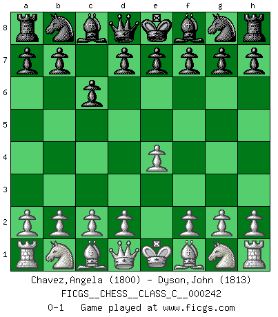 Last move : 0-1 2017 May 21 5:19:47 [Event "FICGS__CHESS__CLASS_C__000242"] [Site "FICGS"] [Date "2017.04.10"] [Round "1"] [White "Chavez,Angela"] [Black "Dyson,John"] [Result "0-1"] [WhiteElo "1800"] [BlackElo "1813"] 1.e4 c6 0-1 This chess game has been lost on time (started : 2017.04.10 20:30:11) Caro-Kann defense Player Black won this chess game. Follow this game move after move (download)I am the best player in the world and I am here to prove it. (Bobby Fischer) Du weisst es gibt ein Problem mit Computern und Fernschach, wenn jeder eine Rating von 2450 hat. (John Christen Knudsen) Diferente gente reacciona diferentemente en aceptar la derrota. (Bobby Fischer) La vie et les Echecs sont tous les deux une lutte constante. (Lasker) Good luck. You're gonna need it. (Han Solo in Star Wars ep.6)