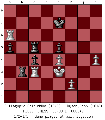 Last move : 1/2-1/2 2017 December 22 17:27:41 [Event "FICGS__CHESS__CLASS_C__000242"] [Site "FICGS"] [Date "2017.04.10"] [Round "1"] [White "Duttagupta,Aniruddha"] [Black "Dyson,John"] [Result "1/2-1/2"] [WhiteElo "1848"] [BlackElo "1813"] 1.c4 e5 2.Nc3 Nf6 3.Nf3 Nc6 4.g3 d5 5.cxd5 Nxd5 6.Bg2 Nb6 7.O-O Be7 8.a3 Be6 9.b4 O-O 10.d3 a5 11.b5 Nd4 12.Bb2 Nb3 13.Rb1 f6 14.Nd2 Nxd2 15.Qxd2 Rb8 16.Qc2 Qd7 17.Bf3 Rfc8 18.Rfd1 Bf8 19.d4 exd4 20.e3 Bf5 21.Be4 Bxe4 22.Nxe4 Qxb5 23.Rxd4 Qf5 24.Bc3 Kh8 25.Qd3 c5 26.Nd6 Qxd3 27.Rxd3 Bxd6 28.Rxb6 Be5 29.Bxe5 fxe5 30.a4 c4 31.Rc3 Rc5 32.e4 h6 33.Kf1 Kg8 34.Ke2 Kf7 35.h4 Ke7 36.Ke3 g5 37.Rxh6 gxh4 38.gxh4 b5 39.axb5 R8xb5 40.Ra6 Rb3 1/2-1/2 English Opening Kingside Castling by player White (move 7) Kingside Castling by player Black (move 9) This chess game ended in a draw. Follow this game move after move (download)Personally, I rather look forward to a computer program winning the world Chess Championship. Humanity needs a lesson in humility. (Richard Dawkings) Unter Putin wird alles Geld aus Russland wie von einem Staubsauger nach Moskau umgeleitet, das ist wie ein schwarzes Loch. (Garry Kasparov) Alguna parte de un error es siempre correcto. (Savielly Tartakover) Les Echecs ont trois composantes : le temps, l'espace et le matériel en dernier. (Mikhail Tal) I've never seen so many men wasted so badly. (Blondie in The Good, The Bad and The Ugly)