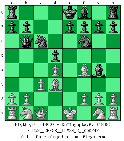 Last move : 0-1 2017 June 3 7:55:39 [Event "FICGS__CHESS__CLASS_C__000242"] [Site "FICGS"] [Date "2017.04.10"] [Round "1"] [White "Blythe,Doug"] [Black "Duttagupta,Aniruddha"] [Result "0-1"] [WhiteElo "1800"] [BlackElo "1848"] 1.d4 d5 2.Bf4 c5 3.e3 Nf6 4.c3 Nc6 5.Bd3 Qb6 6.Qc1 cxd4 7.exd4 Bg4 0-1 This chess game has been lost on time (started : 2017.04.10 20:30:11) Queen's pawn, Mason variation, Steinitz counter-gambit Player Black won this chess game. Follow this game move after move (download)Chess, like love, is infectious at any age. (Flohr) Den Ruhm habe ich schon, jetzt brauche ich noch das Geld. (Wilhelm Steinitz) Puntos débiles o agujeros en la posición de tu oponente deben de ser ocupados por piezas, no Peones. (Siegbert Tarrasch) Les échecs sont plus proches de l'art de l'assassinat que de l'art de la guerre. (Arturo Perez-Reverte) Be who you are, and say what you feel because those who mind don't matter, and those who matter don't mind. (Dr Seuss)