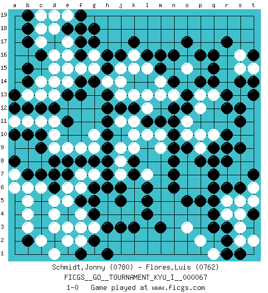 Last move : 1-0 2017 July 22 19:5:52 [Event "FICGS__GO__TOURNAMENT_KYU_I__000067"] [Site "FICGS"] [Date "2017.04.12"] [Round "1"] [Black "Schmidt,Jonny"] [White "Flores,Luis"] [Result "1-0"] [Rating 1 "0780"] [Rating 2 "0762"] 1.q16 d16 2.q4 d4 3.f17 e17 4.f16 e16 5.f3 e3 6.e18 d18 7.f14 e14 8.f13 g15 9.g18 f15 10.e13 d13 11.d14 e15 12.d12 c13 13.c12 c14 14.m3 f4 15.h3 g3 16.r9 q10 17.n10 k10 18.q9 p10 19.g4 f2 20.n12 l12 21.k12 k13 22.l11 k11 23.j12 l10 24.m11 l13 25.h11 m10 26.n8 o11 27.n11 o10 28.o9 p9 29.p8 p7 30.q7 p6 31.r13 q13 32.h9 j9 33.h8 j13 34.h13 j11 35.h12 g10 36.h10 g9 37.n14 m14 38.h15 h14 39.g14 j14 40.m15 l15 41.m16 n13 42.o13 m13 43.l16 j15 44.h16 k16 45.k17 o14 46.p14 n15 47.j16 k15 48.n16 o16 49.o17 p15 50.q14 p13 51.o12 p12 52.p16 o15 53.q15 m9 54.n9 o7 55.n7 o8 56.q8 q6 57.r6 r5 58.q5 r7 59.s6 s7 60.p5 o6 61.n6 s5 62.o5 t6 63.q6 r4 64.g8 f9 65.f8 e9 66.e8 d9 67.d8 c8 68.c7 c6 69.c9 b8 70.b7 b9 71.c10 b6 72.d6 d5 73.r3 s3 74.r2 s2 75.s1 t2 76.k3 a7 77.d7 e6 78.a8 a9 79.b10 b11 80.a10 a6 81.a8 c11 82.b12 b13 83.a13 d15 84.n14 o15 85.q3 q1 86.r1 p2 87.c5 b5 88.c4 b4 89.c3 b3 90.b2 c2 91.d2 d3 92.t4 s8 93.s9 t9 94.t10 t8 95.r17 k4 96.l4 j4 97.j3 h4 98.g5 h5 99.g6 g7 100.h7 f7 101.e7 f6 102.h6 k5 103.l5 k6 104.l6 l7 105.k7 j7 106.k8 j8 107.j6 k9 108.j5 s10 109.r10 t11 110.s11 t10 111.s12 s13 112.s14 s15 113.t14 t12 114.r12 o3 115.t13 t15 116.t16 s16 117.r8 t5 118.t7 s4 119.b14 d14 120.b15 g16 121.g17 d11 122.a12 a11 123.e11 d10 124.b17 c17 125.b18 e19 126.f18 c19 127.b19 c18 128.g2 f3 129.f5 e5 130.f1 d1 131.h1 e2 132.f19 d19 133.c16 1-0 Here are the names of the openings (joseki) played in the four corners : Corner d16 : d16 f17 Hoshi (Hwajeom, Seongjeom, Xingwei`) 4-4 Point. The star or hoshi (4-4) point, emphasizing influence at the potential expense of territory. Ikken Kakari (Hankan Keolch'im, Yi Gua`jiao~, 1-Space Low Approach). Black 2 is the standard approach move to the 4-4. Corner d4 : d4 f3 Hoshi (Hwajeom, Seongjeom, Xingwei`) 4-4 Point. The star or hoshi (4-4) point, emphasizing influence at the potential expense of territory. Ikken Kakari (Hankan Keolch'im, Yi Gua`jiao~, 1-Space Low Approach). Black 2 is the standard approach move to the 4-4. Player Black won this Go (weiqi, baduk) game. Follow this game move after move (download)If there is no stone on the handicap point, the carpenter's square is dead. (Anonymous) Locking firmely the window serves nothing, only small thiefs pass through there, the big thiefs enter through the front door. (Luc-Olivier Leclerc)