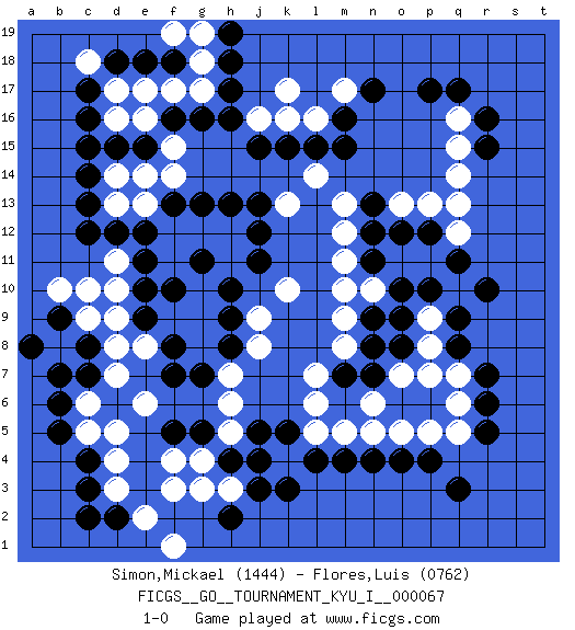 Last move : 1-0 2017 August 5 0:27:57 [Event "FICGS__GO__TOURNAMENT_KYU_I__000067"] [Site "FICGS"] [Date "2017.04.12"] [Round "1"] [Black "Simon,Mickael"] [White "Flores,Luis"] [Result "1-0"] [Rating 1 "1444"] [Rating 2 "0762"] 1.q3 d4 2.r16 d16 3.p17 f17 4.r5 f3 5.r10 c10 6.k3 k17 7.k5 k10 8.p10 n10 9.k15 k16 10.l15 l16 11.e10 d10 12.e9 d9 13.c3 d3 14.c4 c5 15.b5 d5 16.b6 c6 17.c7 d7 18.c8 d8 19.d2 e2 20.c2 f1 21.c17 d17 22.c16 l5 23.l4 m5 24.m4 n5 25.n4 o5 26.o4 p5 27.p4 q5 28.r6 q6 29.r7 q7 30.q8 p8 31.q9 p9 32.o10 o11 33.n11 m11 34.n12 p11 35.n9 m10 36.o8 o7 37.n7 m8 38.n8 n6 39.m7 l7 40.q11 q12 41.p12 p7 42.o9 m9 43.e11 d11 44.e12 l6 45.d12 l14 46.m15 m12 47.n13 m13 48.c15 d14 49.c14 d13 50.c12 c9 51.c13 e13 52.f13 f14 53.j15 o13 54.o12 p13 55.h10 f12 56.g13 g12 57.h13 h12 58.j13 k13 59.j12 h11 60.j11 g10 61.g11 f11 62.f10 g9 63.g11 f9 64.f7 e8 65.f8 g8 66.g7 h7 67.h8 b8 68.b7 j9 69.h9 j8 70.g5 g4 71.h17 q13 72.m16 m17 73.n17 j16 74.h16 q16 75.q17 q15 76.r15 q14 77.d15 e14 78.f16 e16 79.e15 f15 80.g16 g17 81.h4 h3 82.j3 h5 83.j5 h6 84.f5 e6 85.j4 f4 86.h2 g3 87.b9 b10 88.a8 c18 89.d18 e17 90.e18 g18 91.h18 f19 92.f18 g19 93.h19 1-0 Here are the names of the openings (joseki) played in the four corners : Player Black won this Go (weiqi, baduk) game. Follow this game move after move (download)Attach to the strongest stone in a pincer. (Anonymous) The right perception of any matter and a misunderstanding of the same matter do not wholly exclude each other. (Kafka's the trial)