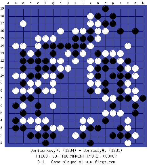 Last move : 0-1 2017 May 15 10:29:57 [Event "FICGS__GO__TOURNAMENT_KYU_I__000067"] [Site "FICGS"] [Date "2017.04.12"] [Round "1"] [Black "Denisenkov,Valentin"] [White "Benassi,Aspasio"] [Result "0-1"] [Rating 1 "1284"] [Rating 2 "1231"] 1.q16 d4 2.q3 c17 3.f3 c6 4.d2 g3 5.g2 f2 6.e2 f4 7.f1 h3 8.c3 q5 9.o4 r3 10.r2 r4 11.p2 r9 12.c12 c14 13.c9 r14 14.o17 m17 15.s16 o18 16.p18 o16 17.n18 n17 18.p17 m18 19.o19 h16 20.e13 e15 21.e8 g6 22.e6 e3 23.f2 l3 24.m3 l4 25.l2 m4 26.n3 o5 27.q11 r11 28.r12 q12 29.r10 s11 30.q10 s10 31.q9 r8 32.p12 q13 33.q8 n12 34.m8 m10 35.o11 n9 36.p6 p5 37.r7 o7 38.o8 n8 39.o9 p7 40.q7 p13 41.s5 s7 42.s6 s8 43.t7 s2 44.n11 m11 45.n10 m9 46.o12 o13 47.p10 g8 48.g14 g15 49.h14 k2 50.m1 c4 51.b3 r1 52.q2 h11 53.f11 g10 54.j12 e9 55.f9 f10 56.e10 d9 57.d10 d8 58.d7 c8 59.c7 b8 60.b6 f8 61.b4 c10 62.c11 b10 63.e5 e4 64.c5 d13 65.d12 d11 66.e11 f13 67.f14 e14 68.e12 g12 69.g11 h12 70.h10 g9 71.g13 j11 72.f12 j13 73.c13 b14 74.j14 k16 75.k13 k12 76.k15 l13 77.k14 f15 78.n13 m12 79.l14 m14 80.m15 n15 81.m16 l16 82.l15 n16 0-1 Here are the names of the openings (joseki) played in the four corners : Corner d4 : d4 f3 Hoshi (Hwajeom, Seongjeom, Xingwei`) 4-4 Point. The star or hoshi (4-4) point, emphasizing influence at the potential expense of territory. Ikken Kakari (Hankan Keolch'im, Yi Gua`jiao~, 1-Space Low Approach). Black 2 is the standard approach move to the 4-4. Corner q4 : q3 q5 Komoku (Somok, Xiao~mu`) 3-4 Point. The komoku (3-4) point is the traditional corner enclosure move.. Ikken Takagakari (Hankan Nop'dakeolch'im, Yi Gaogua`jiao~, 1-Space High Approach). The 5-4 approach move has become more popular in modern times, as modern Go emphasizes speed and influence. Corner d16 : c17 c12 San-San (Sam-Sam, San-San) 3-3 Point. The San-San (3-3) point, emphasizing territory at the expense of influence. Corner q16 : q16 r14 Hoshi (Hwajeom, Seongjeom, Xingwei`) 4-4 Point. The star or hoshi (4-4) point, emphasizing influence at the potential expense of territory. Ikken Kakari (Hankan Keolch'im, Yi Gua`jiao~, 1-Space Low Approach). White 2 is the standard approach move to the 4-4. Player White won this Go (weiqi, baduk) game. Follow this game move after move (download)With only one group, you will win. (Anonymous) Children in the dark cause accidents, accidents in the dark cause children. (Unknown)
