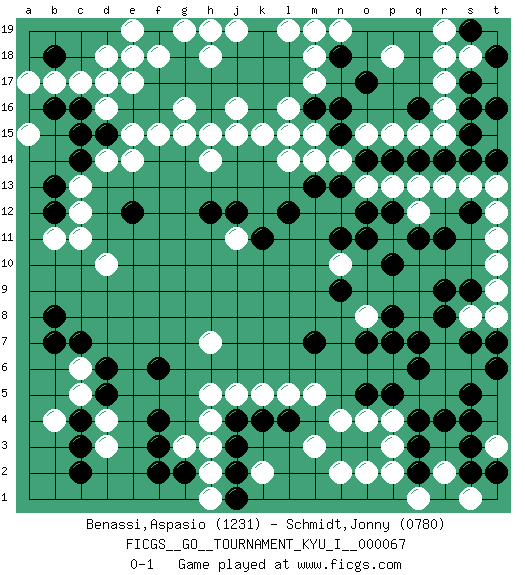 Last move : 0-1 2017 July 5 11:15:27 [Event "FICGS__GO__TOURNAMENT_KYU_I__000067"] [Site "FICGS"] [Date "2017.04.12"] [Round "1"] [Black "Benassi,Aspasio"] [White "Schmidt,Jonny"] [Result "0-1"] [Rating 1 "1231"] [Rating 2 "0780"] 1.q16 d4 2.q4 d16 3.f17 e17 4.f16 f18 5.g18 j11 6.c14 e14 7.d15 e15 8.e16 d14 9.c15 d18 10.c16 d17 11.f19 e18 12.h16 c13 13.b13 c12 14.b12 c11 15.b18 r7 16.n3 h14 17.r9 m5 18.l4 r13 19.r11 q12 20.p10 r5 21.r4 l5 22.k4 k5 23.j4 m17 24.o17 n10 25.o11 o13 26.n11 q5 27.n13 n14 28.o14 p13 29.m13 o15 30.p14 p15 31.q14 q15 32.r14 r15 33.s14 s13 34.s15 r16 35.s16 r17 36.s17 s18 37.t18 r18 38.n15 m14 39.n16 l14 40.l15 m15 41.m16 l16 42.l17 k15 43.k16 l15 44.l18 q13 45.s4 k17 46.k18 j16 47.h17 h15 48.o5 o8 49.p7 j5 50.f4 p4 51.p5 p3 52.t14 t13 53.p8 h5 54.f6 g3 55.f3 h4 56.d5 c5 57.d6 r2 58.s2 m18 59.n18 c6 60.c4 p18 61.c3 s1 62.q2 p2 63.q3 q1 64.s5 s6 65.t2 t3 66.s3 n2 67.o3 o2 68.q6 r6 69.q7 o4 70.o7 s8 71.s9 t9 72.k11 t11 73.t16 m3 74.q11 b11 75.s12 t12 76.t7 t8 77.c7 b17 78.o12 c17 79.b16 a17 80.t6 t19 81.s19 r19 82.r8 t19 83.b7 a15 84.s19 t10 85.s7 n4 86.l12 e19 87.j12 j19 88.j17 g19 89.k16 j15 90.k17 g16 91.h12 f15 92.k19 m19 93.n9 k2 94.g2 d10 95.j3 h3 96.j2 h2 97.f2 h1 98.j1 t19 99.b8 n19 100.s19 h7 101.e12 t19 102.g17 g15 103.p12 t17 104.j18 h19 105.t18 b4 106.s19 d3 107.c2 l19 108.m7 h18 0-1 Here are the names of the openings (joseki) played in the four corners : Corner d16 : d16 f17 Hoshi (Hwajeom, Seongjeom, Xingwei`) 4-4 Point. The star or hoshi (4-4) point, emphasizing influence at the potential expense of territory. Ikken Kakari (Hankan Keolch'im, Yi Gua`jiao~, 1-Space Low Approach). Black 2 is the standard approach move to the 4-4. Corner q4 : q4 r7 Hoshi (Hwajeom, Seongjeom, Xingwei`) 4-4 Point. The star or hoshi (4-4) point, emphasizing influence at the potential expense of territory. Niken Kakari (Dukan Keolch'im, E`r Gua`jiao~, 2-Space Low Approach). Black typically answers by 7-3 or 3-5 (which is not joseki). Corner q16 : q16 r13 Hoshi (Hwajeom, Seongjeom, Xingwei`) 4-4 Point. The star or hoshi (4-4) point, emphasizing influence at the potential expense of territory. Niken Kakari (Dukan Keolch'im, E`r Gua`jiao~, 2-Space Low Approach). Black typically answers by 7-3 or 3-5 (which is not joseki). Corner d4 : d4 j4 Hoshi (Hwajeom, Seongjeom, Xingwei`) 4-4 Point. The star or hoshi (4-4) point, emphasizing influence at the potential expense of territory. Player White won this Go (weiqi, baduk) game. Follow this game move after move (download)Don't reduce your own liberties. (Bill Taylor) Cactus - It is depressed cucumber. (Ilmars Cirulis)