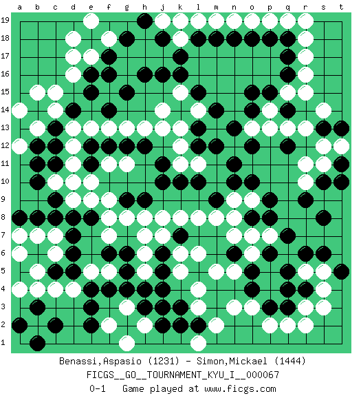Last move : 0-1 2017 September 20 23:19:45 [Event "FICGS__GO__TOURNAMENT_KYU_I__000067"] [Site "FICGS"] [Date "2017.04.12"] [Round "1"] [Black "Benassi,Aspasio"] [White "Simon,Mickael"] [Result "0-1"] [Rating 1 "1231"] [Rating 2 "1444"] 1.q16 d16 2.q4 d4 3.f17 c14 4.q14 o3 5.r6 q2 6.k16 r3 7.r9 r17 8.q17 r16 9.j3 r15 10.c5 c4 11.d5 e5 12.e4 b5 13.b6 b4 14.e3 c6 15.d6 c7 16.d7 q15 17.p15 f5 18.c8 b7 19.b8 a6 20.d8 p14 21.o15 q13 22.o14 p13 23.c12 g3 24.g2 h2 25.h3 f2 26.g4 g1 27.f4 f7 28.g6 f15 29.h16 e17 30.f16 g13 31.e16 d17 32.e15 g11 33.e2 g8 34.f6 l3 35.j2 k12 36.p6 r11 37.p9 e9 38.c2 b2 39.g15 e13 40.b14 b13 41.c13 b15 42.d14 c15 43.b12 a14 44.e11 d13 45.f12 f13 46.g12 h13 47.h12 j13 48.j10 j8 49.l10 l8 50.m12 d11 51.d10 e10 52.c11 d12 53.j11 c10 54.b10 d9 55.c9 d10 56.b1 k5 57.j6 r18 58.q18 q19 59.j16 o19 60.n18 n19 61.m18 m19 62.l18 l19 63.k19 k18 64.o18 p19 65.p18 j19 66.k17 m5 67.s10 s11 68.t11 t12 69.t10 s12 70.b3 a4 71.a8 a7 72.h9 h8 73.t13 s5 74.s6 r5 75.q5 l14 76.l13 m13 77.l12 k13 78.k14 o13 79.n13 n12 80.m14 r10 81.s8 n9 82.n10 o9 83.m9 m8 84.o10 o7 85.n6 o6 86.o5 n5 87.o4 n3 88.o8 n8 89.p8 p7 90.q7 n7 91.r4 s4 92.q3 r2 93.p3 p2 94.t5 s3 95.e18 d18 96.g18 a12 97.b11 f11 98.e12 e19 99.k7 k8 100.j18 k19 101.h19 r19 102.l2 m2 103.k3 l4 104.a2 f18 105.g9 f9 106.e8 f8 107.l5 l6 108.o12 j14 109.n11 k15 110.l15 h5 111.g5 h6 112.j5 j7 113.h4 h7 114.f14 l1 115.k2 k6 116.j4 k11 117.k10 l11 118.q12 r13 119.s13 s14 0-1 Here are the names of the openings (joseki) played in the four corners : Corner d16 : d16 f17 Hoshi (Hwajeom, Seongjeom, Xingwei`) 4-4 Point. The star or hoshi (4-4) point, emphasizing influence at the potential expense of territory. Ikken Kakari (Hankan Keolch'im, Yi Gua`jiao~, 1-Space Low Approach). Black 2 is the standard approach move to the 4-4. Corner q4 : q4 o3 Hoshi (Hwajeom, Seongjeom, Xingwei`) 4-4 Point. The star or hoshi (4-4) point, emphasizing influence at the potential expense of territory. Ikken Kakari (Hankan Keolch'im, Yi Gua`jiao~, 1-Space Low Approach). White 2 is the standard approach move to the 4-4. Corner d4 : d4 j3 Hoshi (Hwajeom, Seongjeom, Xingwei`) 4-4 Point. The star or hoshi (4-4) point, emphasizing influence at the potential expense of territory. Player White won this Go (weiqi, baduk) game. Follow this game move after move (download)Go uses the most elemental materials and concepts - line and circle, wood and stone, black and white - combining them with simple rules to generate subtle strategies and complex tactics that stagger the imagination. (Iwamoto Kaoru, 9 dan professional Go player and former Honinbo title holder) War is the child of passion, passion is the child of narcissism and narcissism is the child. (...) Another game ? (Thibault de Vassal)