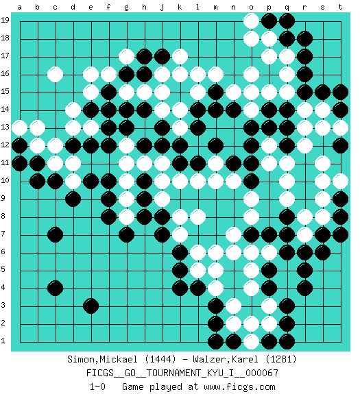 Last move : 1-0 2017 September 20 21:37:26 [Event "FICGS__GO__TOURNAMENT_KYU_I__000067"] [Site "FICGS"] [Date "2017.04.12"] [Round "1"] [Black "Simon,Mickael"] [White "Walzer,Karel"] [Result "1-0"] [Rating 1 "1444"] [Rating 2 "1281"] 1.q3 c16 2.c4 q16 3.r5 k17 4.e3 e16 5.c10 q10 6.k4 k10 7.e10 c12 8.e12 d13 9.k15 l16 10.h16 g17 11.m14 n15 12.q14 r13 13.r16 q17 14.r17 q15 15.r15 r14 16.q13 r12 17.q18 p18 18.r18 p17 19.q12 q11 20.o13 r7 21.c7 q4 22.r4 q5 23.q6 o4 24.r6 p3 25.q2 p2 26.m3 p6 27.q7 r8 28.h17 o8 29.j8 l8 30.k6 m6 31.m12 g10 32.f9 k13 33.h14 l15 34.l14 k14 35.o15 o16 36.o11 n10 37.k12 j15 38.j12 h13 39.j13 h15 40.l13 j14 41.g14 g15 42.f14 j9 43.h8 h11 44.h12 g12 45.g13 o14 46.q8 q9 47.o10 o9 48.p1 o1 49.q1 n2 50.m2 n3 51.p19 o19 52.q19 o18 53.b11 b12 54.s7 s8 55.s6 m4 56.l4 l5 57.k5 k7 58.j7 k8 59.o12 m11 60.t8 s9 61.t9 t10 62.t7 s10 63.s15 s14 64.t14 t13 65.t15 e15 66.a12 a13 67.a11 b13 68.n5 l6 69.f15 f16 70.g16 j16 71.j17 k16 72.t12 s11 73.m1 e13 74.f12 g11 75.f13 c11 76.b10 g9 77.f8 g8 78.g7 s13 79.n1 o2 80.n4 m5 81.p5 o5 82.p4 n6 83.l11 l10 84.n11 m10 85.p7 o6 86.o7 n7 87.m15 m16 88.h9 j10 89.h10 j11 90.n14 p15 91.p14 o15 92.d12 d11 93.f10 d10 94.d9 p12 95.p13 p11 96.e14 d14 97.k11 1-0 Here are the names of the openings (joseki) played in the four corners : Player Black won this Go (weiqi, baduk) game. Follow this game move after move (download)Dead group ? Always win ko fights ! (Anonymous) Excelling at chess has long been considered a symbol of more general intelligence. That is an incorrect assumption in my view, as pleasant as it might be. But for the purposes of argument and investigation, chess is, in Russkin-Gutman's words, 'an unparalleled laboratory, since both the learning process and the degree of ability obtained can be objectified and quantified, providing an excellent comparative framework on which to use rigorous analytical techniques.' (The Chess Master and the Computer, by Garry Kasparov - 2010)