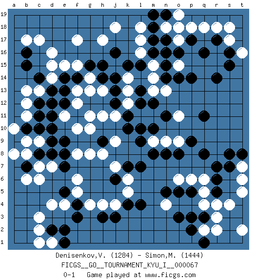 Last move : 0-1 2017 August 17 23:3:6 [Event "FICGS__GO__TOURNAMENT_KYU_I__000067"] [Site "FICGS"] [Date "2017.04.12"] [Round "1"] [Black "Denisenkov,Valentin"] [White "Simon,Mickael"] [Result "0-1"] [Rating 1 "1284"] [Rating 2 "1444"] 1.q16 d16 2.q3 d4 3.f3 c6 4.d2 c3 5.k4 q5 6.q8 n4 7.p5 p6 8.o5 q4 9.o3 r3 10.p3 o6 11.n5 s4 12.q11 o17 13.r14 q18 14.r17 l17 15.c14 f17 16.b16 c17 17.d11 c9 18.e14 o15 19.p14 f5 20.e9 c2 21.e2 b17 22.b15 j4 23.j3 h4 24.h3 g4 25.r6 q6 26.r7 r18 27.j16 g14 28.g15 f15 29.f14 e15 30.h14 g13 31.h15 d14 32.d13 d15 33.e13 h13 34.j13 h11 35.j12 g10 36.k10 k5 37.l4 h8 38.o14 o9 39.o8 b13 40.c12 n9 41.n8 o11 42.p9 n13 43.n14 m11 44.l9 m13 45.m10 m14 46.n15 m15 47.m16 l16 48.n16 k14 49.j14 j11 50.k11 k12 51.l12 k13 52.k15 l11 53.l15 m9 54.l10 j18 55.n11 b11 56.c11 b12 57.n17 c13 58.f11 g11 59.c10 f12 60.e12 f10 61.d9 e11 62.c8 b9 63.b10 b8 64.a9 f13 65.d12 a8 66.b7 a10 67.d10 c7 68.d8 b6 69.h9 f8 70.j6 j9 71.m12 n18 72.m18 o18 73.m17 s17 74.s16 s18 75.o16 t7 76.s7 k6 77.k7 j7 78.l7 t6 79.t8 t5 80.s8 q2 81.p2 r2 82.m8 t16 83.s15 l18 84.m19 h17 85.l13 d1 86.e1 c1 87.r5 r4 88.q1 t2 89.e7 d7 90.e8 g8 91.e5 e4 92.f4 f6 93.n19 o19 94.p17 p18 0-1 Here are the names of the openings (joseki) played in the four corners : Corner d4 : d4 f3 Hoshi (Hwajeom, Seongjeom, Xingwei`) 4-4 Point. The star or hoshi (4-4) point, emphasizing influence at the potential expense of territory. Ikken Kakari (Hankan Keolch'im, Yi Gua`jiao~, 1-Space Low Approach). Black 2 is the standard approach move to the 4-4. Corner q4 : q3 q5 Komoku (Somok, Xiao~mu`) 3-4 Point. The komoku (3-4) point is the traditional corner enclosure move.. Ikken Takagakari (Hankan Nop'dakeolch'im, Yi Gaogua`jiao~, 1-Space High Approach). The 5-4 approach move has become more popular in modern times, as modern Go emphasizes speed and influence. Corner d16 : d16 c14 Hoshi (Hwajeom, Seongjeom, Xingwei`) 4-4 Point. The star or hoshi (4-4) point, emphasizing influence at the potential expense of territory. Ikken Kakari (Hankan Keolch'im, Yi Gua`jiao~, 1-Space Low Approach). Black 2 is the standard approach move to the 4-4. Player White won this Go (weiqi, baduk) game. Follow this game move after move (download)Strange things happen at the one-two points. (Anonymous) Political correctness is subjecting us to gross incompetence. (Johann Piek)