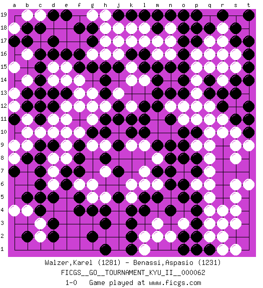 Last move : 1-0 2017 July 29 16:40:2 [Event "FICGS__GO__TOURNAMENT_KYU_II__000062"] [Site "FICGS"] [Date "2017.04.12"] [Round "1"] [Black "Walzer,Karel"] [White "Benassi,Aspasio"] [Result "1-0"] [Rating 1 "1281"] [Rating 2 "1231"] 1.d3 q16 2.c5 q4 3.d16 f17 4.f16 g16 5.f15 e17 6.d17 k17 7.d12 q10 8.o5 q6 9.p3 q3 10.k4 c10 11.c11 d10 12.c8 d8 13.c7 e12 14.d13 g9 15.g4 b11 16.b12 d11 17.c12 b14 18.c14 r15 19.o16 m16 20.p17 q17 21.n15 l14 22.q13 p14 23.o13 p13 24.n13 o11 25.m12 m10 26.l11 k9 27.j12 m8 28.g15 h16 29.h15 r2 30.p2 g12 31.h13 l6 32.l5 k6 33.f7 e8 34.e7 j4 35.k3 j3 36.h3 j2 37.k2 k5 38.m5 m3 39.l4 g5 40.f4 n17 41.q18 r18 42.o18 q19 43.p18 d18 44.c18 n2 45.p4 m2 46.n4 l2 47.k1 h18 48.o8 q8 49.o9 j1 50.g2 m6 51.n6 o3 52.p5 p6 53.o6 l1 54.o2 h7 55.f5 q5 56.p10 p11 57.m15 g6 58.l15 e18 59.l19 p9 60.o10 c2 61.d2 c3 62.c4 b4 63.b5 a4 64.b2 c19 65.b18 b19 66.e16 j16 67.j15 j10 68.h11 g11 69.h10 h9 70.g10 f10 71.j19 j18 72.k19 n18 73.n19 h19 74.e13 g13 75.l10 h12 76.j11 j13 77.h14 k12 78.k11 l9 79.l16 l17 80.f11 e11 81.f9 f12 82.f8 e9 83.c9 b10 84.d9 b9 85.b8 a8 86.a7 a9 87.a11 f6 88.e6 d7 89.c6 d6 90.d5 e10 91.n11 n10 92.n8 m11 93.l12 n12 94.m13 o12 95.o14 p15 96.h4 h5 97.h1 a18 98.b17 a17 99.a16 b16 100.a19 a18 101.a17 a15 102.m18 m17 103.o19 l18 104.m19 k15 105.k16 k14 106.m14 f13 107.p8 q9 108.p7 q7 109.n7 c17 110.m7 l7 111.k10 pass 112.j9 q2 113.q1 p1 114.o1 r1 115.c15 d15 116.b13 r3 117.c16 s4 118.b17 s6 119.h8 s8 120.n9 s10 121.m9 r11 122.a17 r14 123.n11 q11 124.j7 s15 125.g17 r16 126.c18 r17 127.g18 q15 128.d19 p16 129.o17 q12 130.b18 p12 131.f18 h2 132.j5 n16 133.o15 k18 134.e19 j17 135.p1 a13 136.p19 a12 137.r19 e14 138.s18 d14 139.c13 f14 140.s17 e15 141.t16 h17 142.t15 s16 143.t14 t18 144.t17 s19 145.t19 g19 146.t11 s3 147.s13 r4 148.r13 s12 149.t12 r10 150.t10 t9 151.r12 s9 152.s11 t6 153.s14 s5 154.q14 s1 155.pass pass 156.pass pass 157.pass pass 158.pass 1-0 Here are the names of the openings (joseki) played in the four corners : Corner d16 : d16 f17 Hoshi (Hwajeom, Seongjeom, Xingwei`) 4-4 Point. The star or hoshi (4-4) point, emphasizing influence at the potential expense of territory. Ikken Kakari (Hankan Keolch'im, Yi Gua`jiao~, 1-Space Low Approach). White 2 is the standard approach move to the 4-4. Corner q4 : q4 o5 Hoshi (Hwajeom, Seongjeom, Xingwei`) 4-4 Point. The star or hoshi (4-4) point, emphasizing influence at the potential expense of territory. Player Black won this Go (weiqi, baduk) game. Follow this game move after move (download)On the second line six die, eight live. (Anonymous) Employ the attack like tactic of defense. (Chinese proverb)