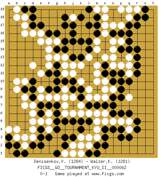 Last move : 0-1 2017 June 8 19:55:2 [Event "FICGS__GO__TOURNAMENT_KYU_II__000062"] [Site "FICGS"] [Date "2017.04.12"] [Round "1"] [Black "Denisenkov,Valentin"] [White "Walzer,Karel"] [Result "0-1"] [Rating 1 "1284"] [Rating 2 "1281"] 1.q16 d4 2.q3 c16 3.f3 f4 4.g4 f5 5.e3 d3 6.h3 c8 7.r5 o17 8.r14 o15 9.h17 k17 10.e17 e16 11.f16 e15 12.d17 c17 13.j15 d12 14.q10 q4 15.r4 q5 16.p3 q8 17.m17 q18 18.r17 n16 19.m16 m15 20.l15 m14 21.l14 n18 22.m18 l16 23.k18 j18 24.l17 k16 25.h18 l13 26.k15 q12 27.r12 q13 28.r13 q11 29.r11 m4 30.q6 p5 31.p6 o5 32.o6 n5 33.d10 c10 34.c9 b9 35.d9 b10 36.d8 c7 37.g9 k3 38.n3 m3 39.o10 j6 40.d2 c2 41.e2 j2 42.h2 k10 43.f11 f15 44.g16 f12 45.g12 h11 46.g11 f13 47.j3 k2 48.k4 l6 49.h5 h6 50.j5 n8 51.p8 n10 52.p11 o13 53.n11 m10 54.q14 o12 55.o11 m12 56.k13 k12 57.j13 g15 58.h15 h12 59.h10 f8 60.f9 e8 61.j10 j11 62.k9 l9 63.k8 h8 64.l7 k7 65.e6 d7 66.e7 g8 67.g6 j8 68.n7 l8 69.m7 m6 70.o8 m8 71.j9 h9 72.g10 g13 73.m2 l3 74.k5 k6 75.g5 e9 76.e4 d6 77.p16 n17 78.j17 e5 79.g7 h7 80.p14 o14 81.r18 p17 82.b2 c3 83.c1 b3 84.b1 n6 85.o7 c18 86.d18 h13 87.o16 d16 88.l5 o9 89.p9 n9 90.c19 m19 91.j16 b19 92.d19 b18 93.l19 n19 94.q17 p19 95.n4 m5 96.o4 l2 97.n2 r19 98.s19 q19 99.h14 m11 100.n12 n13 101.g14 f14 102.a3 a4 103.a2 b4 104.s18 p12 105.p10 p15 106.q15 h1 107.g1 j1 108.l1 e11 109.p4 k1 110.m1 f6 111.f7 d5 112.pass j12 0-1 Here are the names of the openings (joseki) played in the four corners : Corner d4 : d4 f3 Hoshi (Hwajeom, Seongjeom, Xingwei`) 4-4 Point. The star or hoshi (4-4) point, emphasizing influence at the potential expense of territory. Ikken Kakari (Hankan Keolch'im, Yi Gua`jiao~, 1-Space Low Approach). Black 2 is the standard approach move to the 4-4. Corner q16 : q16 o17 Hoshi (Hwajeom, Seongjeom, Xingwei`) 4-4 Point. The star or hoshi (4-4) point, emphasizing influence at the potential expense of territory. Ikken Kakari (Hankan Keolch'im, Yi Gua`jiao~, 1-Space Low Approach). White 2 is the standard approach move to the 4-4. Corner d16 : c16 h17 Komoku (Somok, Xiao~mu`) 3-4 Point. The komoku (3-4) point is the traditional corner enclosure move.. Player White won this Go (weiqi, baduk) game. Follow this game move after move (download)Don't defend - extend ! (Bill Taylor) Beep ! (R2D2 in Star Wars ep.3)