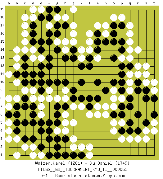 Last move : 0-1 2017 July 12 12:31:50 [Event "FICGS__GO__TOURNAMENT_KYU_II__000062"] [Site "FICGS"] [Date "2017.04.12"] [Round "1"] [Black "Walzer,Karel"] [White "Xu,Daniel"] [Result "0-1"] [Rating 1 "1281"] [Rating 2 "1749"] 1.d3 q16 2.c5 p3 3.d16 f17 4.h17 d14 5.e15 c17 6.d17 c16 7.d15 c15 8.e14 d13 9.d10 j3 10.q4 q3 11.r4 r3 12.p4 o4 13.q7 o5 14.o16 r14 15.q12 s12 16.r10 j16 17.g16 m17 18.p17 q17 19.m16 l16 20.m15 n17 21.o15 j17 22.g3 j5 23.k10 p13 24.p12 q13 25.o13 l15 26.m14 o7 27.f12 d9 28.c8 c9 29.d11 d8 30.c7 f8 31.h7 e6 32.g5 e10 33.e12 b10 34.c11 b12 35.n9 k7 36.j13 h18 37.g17 g18 38.f16 s4 39.r6 e3 40.e4 f3 41.f4 d2 42.e2 f2 43.g2 e1 44.c3 c2 45.s5 s3 46.p9 p18 47.o17 o18 48.c12 b13 49.c13 c14 50.b11 a11 51.m8 m6 52.k1 k2 53.j1 l1 54.g1 b3 55.b4 a3 56.d5 l2 57.h1 s10 58.s9 s11 59.g10 h8 60.g7 g8 61.j9 p8 62.q8 o9 63.o10 o8 64.m10 c18 65.f18 d18 66.e18 t9 67.s8 r12 68.p14 q14 69.d7 e7 70.f10 h15 71.g14 h14 72.h13 l14 73.l13 h9 74.h10 b8 75.f1 b1 76.e2 d1 77.l7 l6 78.k8 j7 79.b7 a7 80.a6 a8 81.t8 t10 82.g19 j19 83.p6 m7 84.l8 g15 85.f15 e13 86.f13 p5 87.o6 n6 88.q5 k14 89.p15 q15 90.e9 f9 91.e11 h6 92.g6 h5 93.j8 h4 94.d6 g4 95.e5 a5 96.b6 a4 97.b5 k13 98.k12 n16 99.n15 m13 100.l12 q11 101.p11 q9 102.p10 q10 103.r9 r11 104.p7 n7 105.f5 t5 106.t6 t4 107.j14 j15 108.e10 e8 109.h3 j2 110.f3 e19 111.f19 d19 112.c10 b14 0-1 Here are the names of the openings (joseki) played in the four corners : Corner d16 : d16 f17 Hoshi (Hwajeom, Seongjeom, Xingwei`) 4-4 Point. The star or hoshi (4-4) point, emphasizing influence at the potential expense of territory. Ikken Kakari (Hankan Keolch'im, Yi Gua`jiao~, 1-Space Low Approach). White 2 is the standard approach move to the 4-4. Corner q4 : p3 q4 Mokuhazushi (Waemok, Wai`mu`) 5-3 Point. The mokuhazushi (5-3) point was popular in the Edo period in Japan (1600 - 1867). It emphasizes influence; territorially, it is inferior to the 3-4 point. Corner q16 : q16 o16 Hoshi (Hwajeom, Seongjeom, Xingwei`) 4-4 Point. The star or hoshi (4-4) point, emphasizing influence at the potential expense of territory. Ikken Takagakari (Hankan Nop'dakeolch'im, Yi Gaojia, 1-Space High Approach). White typically responds at 6-4 or 3-10. White 4-10 is played when White finds play on the right side advantageous. White 4-8 or 3-8 may be played when White has support at top. Player White won this Go (weiqi, baduk) game. Follow this game move after move (download)The enemy's vital point is your own. (Anonymous) We need strong personalities and only one world champion to attract sponsors. (Anatoly Karpov)
