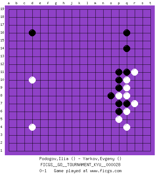 Last move : 0-1 2007 June 13 13:22:31 [Event "FICGS__GO__TOURNAMENT_KYU__000028"] [Site "FICGS"] [Date "2007.04.05"] [Round "1"] [Black "Podogov,Ilia"] [White "Yarkov,Evgeny"] [Result "0-1"] 1.d16 d4 2.q16 q4 3.q14 q10 4.p10 d10 5.q11 q9 6.p9 q8 7.q7 r7 8.p7 p8 9.o8 r11 10.p11 q6 11.p6 p5 0-1 This go game has been lost on time (started : 2007.04.05 3:15:26) Here are the names of the openings (joseki) played in the four corners : Player White won this Go (weiqi, baduk) game. Follow this game move after move (download)Play slow, win slow; play fast, lose fast. (Anonymous) Man is still the most extraordinary computer of all. (John F. Kennedy)