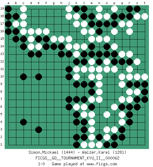 Last move : 1-0 2017 September 12 15:43:5 [Event "FICGS__GO__TOURNAMENT_KYU_II__000062"] [Site "FICGS"] [Date "2017.04.12"] [Round "1"] [Black "Simon,Mickael"] [White "Walzer,Karel"] [Result "1-0"] [Rating 1 "1444"] [Rating 2 "1281"] 1.q3 d16 2.c4 r16 3.r5 k17 4.e3 p16 5.c10 f16 6.k4 q10 7.e10 q4 8.r4 q5 9.q6 o5 10.c14 d14 11.d13 e14 12.c15 c16 13.j11 p3 14.q2 m4 15.l3 m3 16.n17 m16 17.p18 r17 18.m17 l16 19.l18 k18 20.r18 r7 21.r6 q7 22.k7 p6 23.r12 r13 24.q12 q13 25.p12 r11 26.p13 p14 27.m13 m10 28.m11 n10 29.j13 s12 30.n16 l14 31.k9 m7 32.p2 o3 33.e13 j14 34.h14 j15 35.f14 h15 36.g14 k13 37.k12 s18 38.q18 n11 39.n13 n15 40.k19 j19 41.l19 j18 42.b16 b17 43.b15 c17 44.a17 a18 45.a16 l11 46.l12 m12 47.l13 k14 48.s7 s8 49.s6 o18 50.o17 n18 51.o19 n19 52.r19 p19 53.p17 o15 54.s9 r8 55.t8 s10 56.r9 q9 57.s19 t18 58.n2 m2 59.l2 l1 60.k1 m1 61.k2 r10 62.t9 t10 63.t7 l5 64.k5 o2 65.e15 d15 66.f15 e16 67.b18 c18 68.a19 p11 69.n12 m11 70.m8 n8 71.m6 l6 72.l7 n7 73.m9 k10 74.j10 k6 75.j6 l17 76.m18 g15 77.h13 n9 78.l4 m5 79.l9 q17 80.m14 m15 81.o1 n1 82.p1 o12 83.o13 o11 84.j7 k11 85.a18 c19 86.o14 1-0 Here are the names of the openings (joseki) played in the four corners : Player Black won this Go (weiqi, baduk) game. Follow this game move after move (download)Balance is not what players strike for, and if it does arise, it is in spite of them. (Pierre Audouard) Mandala - that's it! 16x16 squares as multiple of the four and the eight because of the Four Noble Truths and the Noble Eightfold Path. (Heinz-Georg Lehnhoff about Big Chess)