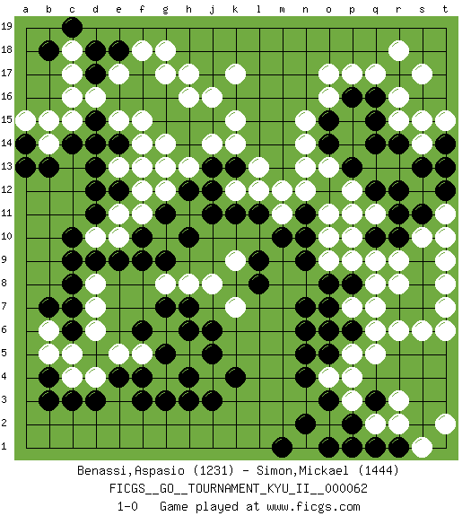 Last move : 1-0 2017 September 20 21:29:9 [Event "FICGS__GO__TOURNAMENT_KYU_II__000062"] [Site "FICGS"] [Date "2017.04.12"] [Round "1"] [Black "Benassi,Aspasio"] [White "Simon,Mickael"] [Result "1-0"] [Rating 1 "1231"] [Rating 2 "1444"] 1.q16 d4 2.q3 d16 3.f3 q5 4.c6 e5 5.c3 d7 6.d3 g4 7.f4 f5 8.g5 j4 9.h4 h5 10.g3 g6 11.j5 g4 12.h3 p3 13.p2 p4 14.o3 o2 15.n2 q2 16.o1 r3 17.j6 o16 18.q14 q17 19.r17 p17 20.r10 k17 21.c9 d6 22.c7 d8 23.d9 c5 24.c8 r18 25.c14 r16 26.g16 c15 27.d14 c18 28.f9 g8 29.h10 j8 30.h6 r15 31.l8 k9 32.k11 k7 33.r7 p7 34.k4 k14 35.h7 h8 36.n5 g14 37.e18 f15 38.e16 e15 39.d15 c16 40.f16 g18 41.h14 h13 42.h15 g12 43.j13 j14 44.j12 g10 45.g9 h16 46.g15 f14 47.h12 g13 48.g11 f12 49.d12 f11 50.f10 e11 51.d11 h17 52.j15 k15 53.d18 b14 54.b13 b15 55.b18 e17 56.f17 f18 57.d17 c17 58.c19 j16 59.a14 g17 60.l9 b6 61.b4 b5 62.g7 c4 63.b3 n13 64.r14 s14 65.s13 s15 66.r12 s6 67.s7 r6 68.e4 q7 69.n7 t7 70.s9 t9 71.t10 t8 72.s8 t6 73.o14 n14 74.o15 n15 75.q1 r2 76.r1 s1 77.p1 t2 78.q15 o13 79.p13 p12 80.q12 p11 81.n11 o11 82.n10 o6 83.n6 e10 84.e9 d10 85.c10 a15 86.a13 o4 87.n4 l12 88.b7 q9 89.l11 m12 90.o8 o9 91.n9 p9 92.p16 o17 93.t14 s17 94.o5 p5 95.o7 t15 96.t13 m11 97.m10 k12 98.k13 l13 99.j11 q11 100.g5 e13 101.d13 r9 102.r11 n12 103.p6 r8 104.j3 s10 105.s11 t11 106.t12 t10 107.p8 o10 108.q10 q6 109.o6 q8 110.e12 e17 111.e14 p10 112.f13 n1 113.m1 e13 114.f6 f13 115.pass 1-0 Here are the names of the openings (joseki) played in the four corners : Corner d4 : d4 f3 Hoshi (Hwajeom, Seongjeom, Xingwei`) 4-4 Point. The star or hoshi (4-4) point, emphasizing influence at the potential expense of territory. Ikken Kakari (Hankan Keolch'im, Yi Gua`jiao~, 1-Space Low Approach). Black 2 is the standard approach move to the 4-4. Corner q4 : q3 q5 Komoku (Somok, Xiao~mu`) 3-4 Point. The komoku (3-4) point is the traditional corner enclosure move.. Ikken Takagakari (Hankan Nop'dakeolch'im, Yi Gaogua`jiao~, 1-Space High Approach). The 5-4 approach move has become more popular in modern times, as modern Go emphasizes speed and influence. Corner q16 : q16 o16 Hoshi (Hwajeom, Seongjeom, Xingwei`) 4-4 Point. The star or hoshi (4-4) point, emphasizing influence at the potential expense of territory. Ikken Takagakari (Hankan Nop'dakeolch'im, Yi Gaojia, 1-Space High Approach). Black typically responds at 6-4 or 3-10. Black 4-10 is played when Black finds play on the right side advantageous. Black 4-8 or 3-8 may be played when Black has support at top. Corner d16 : d16 c14 Hoshi (Hwajeom, Seongjeom, Xingwei`) 4-4 Point. The star or hoshi (4-4) point, emphasizing influence at the potential expense of territory. Ikken Kakari (Hankan Keolch'im, Yi Gua`jiao~, 1-Space Low Approach). Black 2 is the standard approach move to the 4-4. Player Black won this Go (weiqi, baduk) game. Follow this game move after move (download)Learn the eye-stealing tesuji. (Anonymous) I find your interest interesting. (Gregory House, House M.D.)