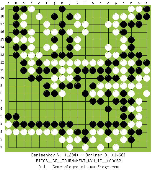 Last move : 0-1 2017 May 10 16:55:2 [Event "FICGS__GO__TOURNAMENT_KYU_II__000062"] [Site "FICGS"] [Date "2017.04.12"] [Round "1"] [Black "Denisenkov,Valentin"] [White "Bartner,Douglas"] [Result "0-1"] [Rating 1 "1284"] [Rating 2 "1468"] 1.q16 r4 2.d4 d16 3.p4 n3 4.r3 q3 5.q4 p3 6.o3 o2 7.r5 s4 8.s3 s5 9.q6 s6 10.o4 r8 11.p2 q2 12.n2 p1 13.n4 m3 14.m4 m2 15.c14 f17 16.b16 c17 17.d10 o17 18.r14 l17 19.r11 f3 20.h3 c3 21.c4 d3 22.e4 e3 23.f4 g3 24.g4 d12 25.c12 d14 26.k10 d11 27.c11 k12 28.e10 g12 29.l3 g10 30.f8 b3 31.b4 a4 32.a5 a3 33.b5 h8 34.h9 g9 35.g8 h10 36.j9 c15 37.b14 b15 38.a15 o14 39.m11 m12 40.n11 p8 41.n7 o7 42.o6 n8 43.m7 m8 44.l8 q18 45.r17 j10 46.k9 n12 47.o12 o13 48.p12 s10 49.r10 s9 50.s11 r18 51.s18 s19 52.s17 q14 53.q13 q15 54.r15 p16 55.p7 p9 56.o8 o9 57.f11 f12 58.e12 e13 59.e11 d13 60.l11 l12 61.b17 c18 62.b18 c13 63.b13 h2 64.l2 n1 65.j2 j3 66.h4 k2 67.k3 j1 68.j4 j2 69.q17 p17 70.c19 d19 71.b19 e18 72.g11 h11 73.k11 j11 74.f9 t11 75.t12 t10 76.s12 r9 77.m9 n9 78.n10 p13 79.q7 r6 80.q5 q12 81.r13 q11 82.p10 p11 83.o11 q10 84.o10 l1 85.q8 q9 86.r7 s7 87.r2 t8 88.c16 d15 89.t18 r12 90.s13 r19 91.h17 g16 92.h16 k18 93.k16 l16 94.j14 k15 95.g15 f16 96.j15 k14 97.h13 h12 98.j13 j12 99.j18 k17 100.g18 j16 101.h19 g14 102.g13 f14 103.t19 p18 0-1 Here are the names of the openings (joseki) played in the four corners : Corner q4 : r4 p4 Komoku (Somok, Xiao~mu`) 3-4 Point. The komoku (3-4) point is the traditional corner enclosure move.. Ikken Takagakari (Hankan Nop'dakeolch'im, Yi Gaogua`jiao~, 1-Space High Approach). The 5-4 approach move has become more popular in modern times, as modern Go emphasizes speed and influence. Corner d16 : d16 c14 Hoshi (Hwajeom, Seongjeom, Xingwei`) 4-4 Point. The star or hoshi (4-4) point, emphasizing influence at the potential expense of territory. Ikken Kakari (Hankan Keolch'im, Yi Gua`jiao~, 1-Space Low Approach). Black 2 is the standard approach move to the 4-4. Corner q16 : q16 o17 Hoshi (Hwajeom, Seongjeom, Xingwei`) 4-4 Point. The star or hoshi (4-4) point, emphasizing influence at the potential expense of territory. Ikken Kakari (Hankan Keolch'im, Yi Gua`jiao~, 1-Space Low Approach). White 2 is the standard approach move to the 4-4. Corner d4 : d4 f3 Hoshi (Hwajeom, Seongjeom, Xingwei`) 4-4 Point. The star or hoshi (4-4) point, emphasizing influence at the potential expense of territory. Ikken Kakari (Hankan Keolch'im, Yi Gua`jiao~, 1-Space Low Approach). White 2 is the standard approach move to the 4-4. Player White won this Go (weiqi, baduk) game. Follow this game move after move (download)The possibility or impossibility of an event results logically from the rules. (Pierre Audouard) Kids, you tried your best and you failed miserably. The lesson is, never try. (Simpsons)