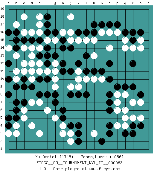 Last move : 1-0 2017 September 21 19:23:36 [Event "FICGS__GO__TOURNAMENT_KYU_II__000062"] [Site "FICGS"] [Date "2017.04.12"] [Round "1"] [Black "Xu,Daniel"] [White "Zdana,Ludek"] [Result "1-0"] [Rating 1 "1749"] [Rating 2 "1086"] 1.q16 d4 2.q3 d16 3.r9 r14 4.r15 q14 5.o17 d10 6.k4 h3 7.k2 e3 8.r12 o14 9.o12 p16 10.p17 s15 11.s16 s14 12.f17 e17 13.f16 d13 14.k16 q15 15.r16 o16 16.n17 n16 17.m17 q5 18.o4 r7 19.r4 q8 20.q9 p8 21.p9 p4 22.o3 q4 23.r3 r5 24.o6 p6 25.o7 p7 26.o8 s5 27.f10 d7 28.h5 m13 29.m11 f6 30.g7 g5 31.h6 f13 32.c10 c11 33.d9 b10 34.c9 e11 35.c7 c6 36.b6 c5 37.b9 b11 38.b5 b4 39.b7 h16 40.h15 g15 41.g16 j15 42.h14 j16 43.f14 e14 44.g13 f15 45.e15 e18 46.d15 e16 47.c15 c16 48.b16 b17 49.b14 j18 50.f18 c18 51.j14 k15 52.l16 l15 53.m16 m15 54.k12 g9 55.e10 d11 56.e8 e7 57.f8 g12 58.h11 g11 59.h12 g10 60.g8 j9 61.k8 k9 62.l8 l10 63.l11 m3 64.n2 j2 65.k3 m10 66.n11 n10 67.o10 h4 68.j4 j3 69.a4 a3 70.a5 b3 71.s8 s7 72.s4 q6 73.f12 f11 74.e13 d14 75.c13 e12 76.f13 k11 77.j11 k10 78.l13 d12 79.j8 c14 80.b15 b13 81.a10 a14 82.a16 c12 83.a12 a9 84.a8 1-0 Here are the names of the openings (joseki) played in the four corners : Corner q16 : q16 r14 Hoshi (Hwajeom, Seongjeom, Xingwei`) 4-4 Point. The star or hoshi (4-4) point, emphasizing influence at the potential expense of territory. Ikken Kakari (Hankan Keolch'im, Yi Gua`jiao~, 1-Space Low Approach). White 2 is the standard approach move to the 4-4. Corner d16 : d16 f17 Hoshi (Hwajeom, Seongjeom, Xingwei`) 4-4 Point. The star or hoshi (4-4) point, emphasizing influence at the potential expense of territory. Ikken Kakari (Hankan Keolch'im, Yi Gua`jiao~, 1-Space Low Approach). Black 2 is the standard approach move to the 4-4. Player Black won this Go (weiqi, baduk) game. Follow this game move after move (download)Atari, atari is vulgar play. (Anonymous) A mistake is only a mistake if you let it happen twice. Otherwise it is a learning experience. (Daniel Parmet)