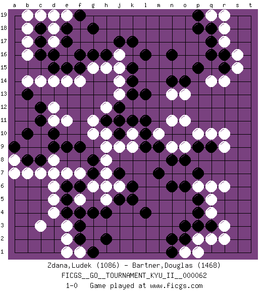 Last move : 1-0 2017 November 12 15:15:24 [Event "FICGS__GO__TOURNAMENT_KYU_II__000062"] [Site "FICGS"] [Date "2017.04.12"] [Round "1"] [Black "Zdana,Ludek"] [White "Bartner,Douglas"] [Result "1-0"] [Rating 1 "1086"] [Rating 2 "1468"] 1.q16 q4 2.c16 d4 3.j17 d14 4.d15 c14 5.c11 e14 6.f16 e11 7.d9 c7 8.c8 d7 9.f9 b17 10.c17 b16 11.o3 r6 12.l4 r14 13.r15 q14 14.n16 r10 15.f3 e3 16.g4 e2 17.f2 g11 18.b13 b14 19.b8 b7 20.p5 q5 21.q9 q10 22.p9 o11 23.n14 r17 24.q17 s15 25.r16 s16 26.p4 q2 27.k14 g15 28.g16 h15 29.h16 j15 30.l16 r18 31.q18 q19 32.p19 r19 33.p18 r9 34.l9 g6 35.j5 h5 36.h4 f1 37.g1 e1 38.h2 j6 39.k5 f5 40.k6 p6 41.o6 o7 42.n6 n7 43.m7 n9 44.n10 o9 45.p7 q6 46.o10 p10 47.m9 n11 48.o8 m10 49.n8 h9 50.j7 h6 51.k15 j16 52.k17 b18 53.f15 f14 54.e15 j13 55.p15 d18 56.c18 c19 57.e18 d17 58.e17 e19 59.f19 d19 60.d16 b19 61.g18 o13 62.o14 n13 63.l13 p2 64.o2 j14 65.l11 o1 66.n1 p1 67.n2 a8 68.a9 a7 69.b10 d8 70.d10 d11 71.c12 k10 72.l10 k9 73.f6 f7 74.e6 d6 75.e5 e7 76.e4 d5 77.f4 c3 78.g7 h7 79.g8 h8 80.e9 d12 81.q3 r3 82.p3 r2 83.k11 j11 84.j12 h12 85.j10 j9 86.h11 g10 87.k13 h10 88.j11 1-0 Here are the names of the openings (joseki) played in the four corners : Corner d4 : d4 d9 Hoshi (Hwajeom, Seongjeom, Xingwei`) 4-4 Point. The star or hoshi (4-4) point, emphasizing influence at the potential expense of territory. Corner q4 : q4 o3 Hoshi (Hwajeom, Seongjeom, Xingwei`) 4-4 Point. The star or hoshi (4-4) point, emphasizing influence at the potential expense of territory. Ikken Kakari (Hankan Keolch'im, Yi Gua`jiao~, 1-Space Low Approach). Black 2 is the standard approach move to the 4-4. Corner q16 : q16 r14 Hoshi (Hwajeom, Seongjeom, Xingwei`) 4-4 Point. The star or hoshi (4-4) point, emphasizing influence at the potential expense of territory. Ikken Kakari (Hankan Keolch'im, Yi Gua`jiao~, 1-Space Low Approach). White 2 is the standard approach move to the 4-4. Player Black won this Go (weiqi, baduk) game. Follow this game move after move (download)Don't make dango's. (Anonymous) It is not enough to be a good player... you must also play well. (Siegbert Tarrasch)