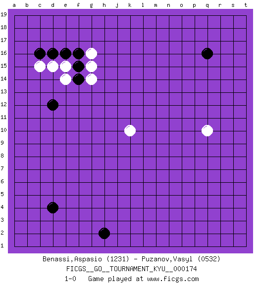 Last move : 1-0 2017 May 27 15:54:1 [Event "FICGS__GO__TOURNAMENT_KYU__000174"] [Site "FICGS"] [Date "2017.04.13"] [Round "1"] [Black "Benassi,Aspasio"] [White "Puzanov,Vasyl"] [Result "1-0"] [Rating 1 "1231"] [Rating 2 "0532"] 1.q16 q10 2.d4 k10 3.e16 e15 4.d16 d15 5.c16 c15 6.f16 g16 7.f15 g15 8.f14 g14 9.d12 e14 10.h2 1-0 Here are the names of the openings (joseki) played in the four corners : Corner d16 : e16 e15 Takamoku (Gomok, Gaomu`) 5-4 Point. The takamoku (high) point (5-4). With its emphasis on influence, the 5-4 point complements the 4-4 (hoshi) point in creating an influence-oriented fuseki. Player Black won this Go (weiqi, baduk) game. Follow this game move after move (download)For rectangular six in the corner, dame is necessary. (Anonymous) Looking at the proliferation of personal web pages on the Net, it looks like very soon everyone on Earth will have 15 megabytes of fame. (M.G. Sriram)