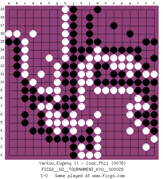 Last move : 1-0 2007 October 12 21:28:50 [Event "FICGS__GO__TOURNAMENT_KYU__000028"] [Site "FICGS"] [Date "2007.04.05"] [Round "1"] [Black "Yarkov,Evgeny"] [White "Cook,Phil"] [Result "1-0"] [Rating 2 "0078"] 1.q16 q4 2.d4 d16 3.o17 q13 4.q14 p13 5.p14 n13 6.o14 o13 7.n14 l13 8.l14 m14 9.m15 m13 10.k14 r12 11.k13 k12 12.j12 k11 13.j11 k10 14.j10 k9 15.j9 k8 16.j8 k7 17.j7 k5 18.j5 j4 19.h4 j6 20.h6 h5 21.g5 j5 22.j3 g4 23.h3 g6 24.h7 f5 25.g3 d6 26.f4 g5 27.f3 f7 28.f8 d8 29.d9 e9 30.e8 d10 31.c9 e11 32.d7 f9 33.c8 g8 34.g7 e7 35.d8 g10 36.h8 g9 37.e5 f6 38.e6 d5 39.e4 h13 40.j13 h14 41.c5 k15 42.l15 k16 43.l16 k17 44.l17 k18 45.l18 l19 46.m19 k19 47.c10 c11 48.b11 c12 49.b12 c13 50.b13 c14 51.b14 c15 52.b15 b16 53.k3 m3 54.l3 m4 55.r13 s13 56.r14 s14 57.s15 t14 58.t15 m2 59.l4 l5 60.s12 s11 61.t13 t11 62.r11 q12 63.r10 r8 64.s10 q9 65.q10 p9 66.p10 o9 67.o10 n9 68.n10 m9 69.m10 l10 70.r9 q7 71.s8 s7 72.t10 t8 73.s9 t9 74.t7 t6 75.t8 k2 76.l2 l1 77.j2 k1 78.s6 r7 79.t5 r5 80.r6 q6 81.s5 s4 82.t4 t3 83.t6 s2 84.m11 l12 85.j14 h16 86.j15 h15 87.j16 h17 88.j17 h18 89.j18 h19 90.j19 g12 91.h11 g11 92.j1 m1 93.a15 a16 94.m12 q11 95.p11 p12 96.n12 o12 97.o11 l11 98.c6 m6 99.h12 f13 100.h10 1-0 Here are the names of the openings (joseki) played in the four corners : Corner d16 : d16 j12 Hoshi (Hwajeom, Seongjeom, Xingwei`) 4-4 Point. The star or hoshi (4-4) point, emphasizing influence at the potential expense of territory. Player Black won this Go (weiqi, baduk) game. Follow this game move after move (download)In opponents' sphere of influence, avoid sharp conflict, don't move too deep. (Otake Hideo, 9p) Work expands to fill the time available. (C. Northcote Parkinson, in Parkinson's Laws)
